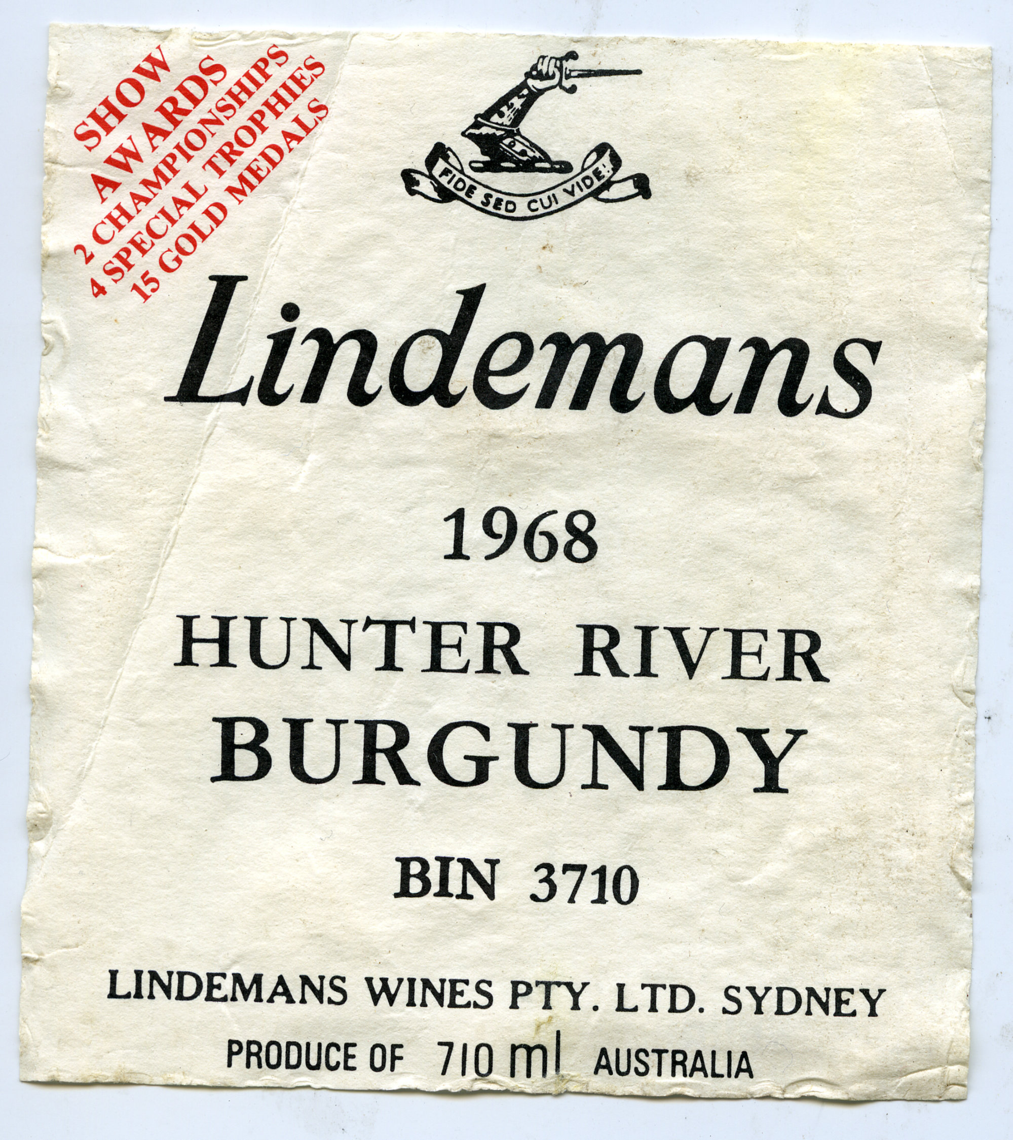 Label reads: "Show awards: 2 championships, 4 special trophies, 15 gold medals. Lindemans. 1968. Hunter river burgundy. Bin 3710. Lindemans Wines Pty. Ltd. Sydney. Produce of 710ml Australia."