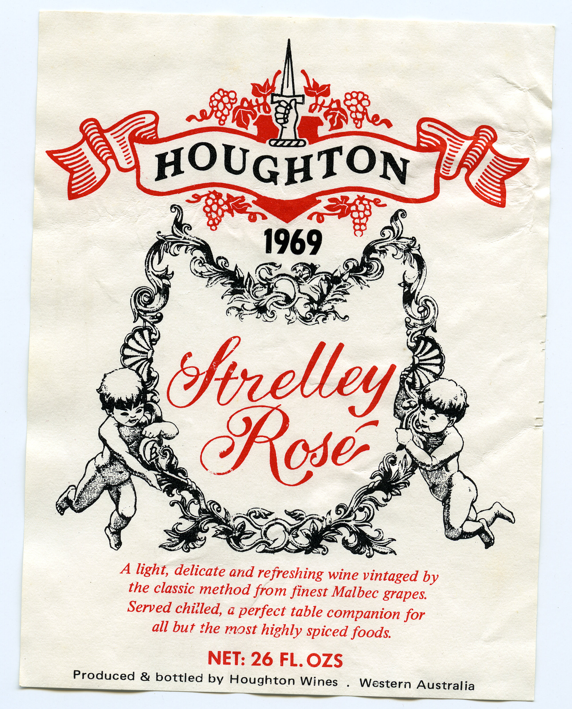 Label reads: "Houghton. 1969. Strelley Rose. A light, delicate and refreshing wine vintaged by the classic method from finest Malbec grapes. Served chilled, a perfect table companion for all but the most highly spiced foods. Net: 26 fl. ozs. Produced and bottled by Houghton Wines. Western Australia."