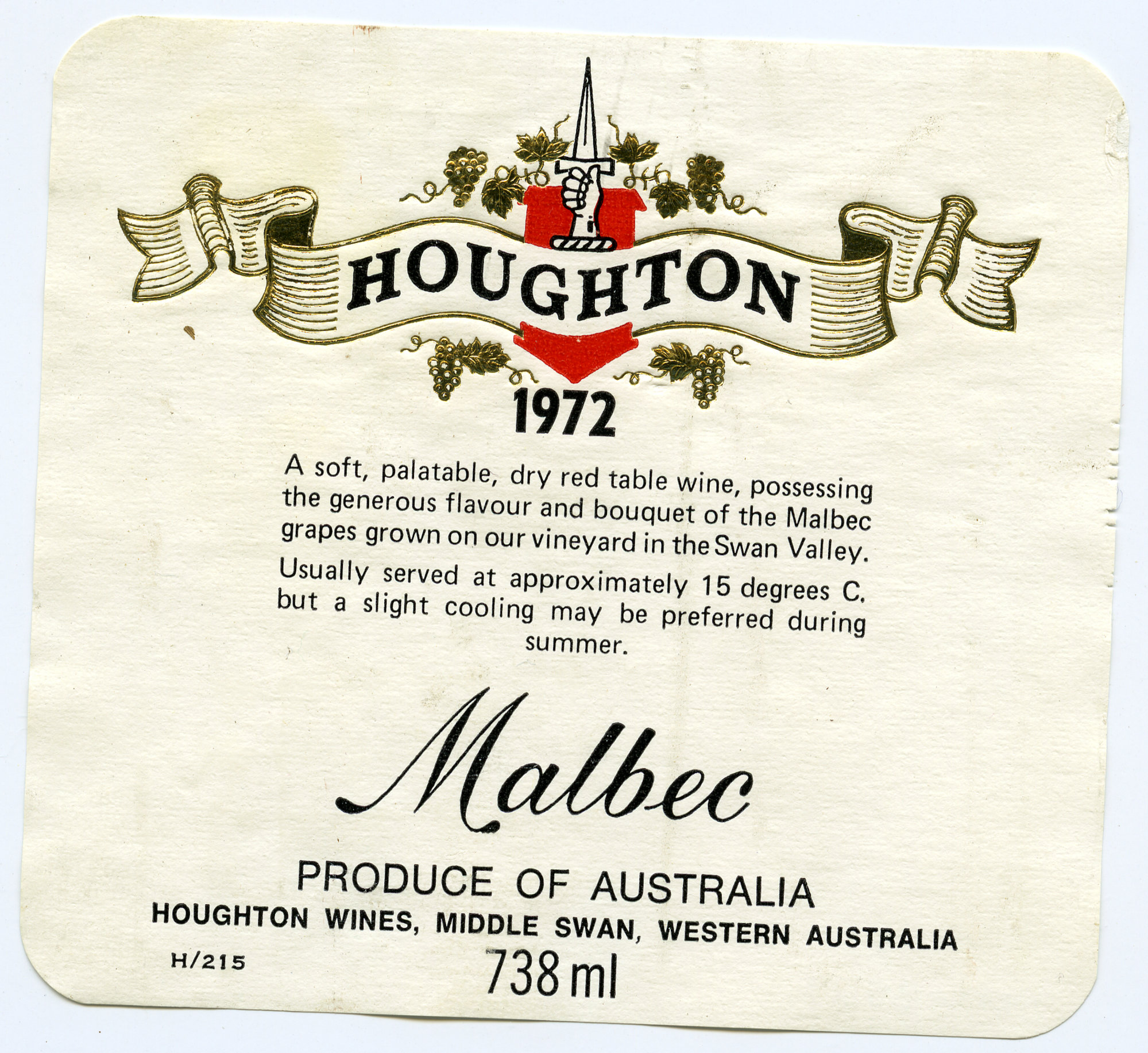 Label reads: "Houghton. 1972. A soft, palatable, dry red table wine, possessing the generous flavour and bouquet of the Malbec grapes grown on our vineyard in the Swan Valley. Usually served at approximately sixty degrees F. but a slight cooling may be preferred during summer. Malbec. Produce of Australia. Houghton Wines, Middle swan, Western Australia. H/215. 738ml."
