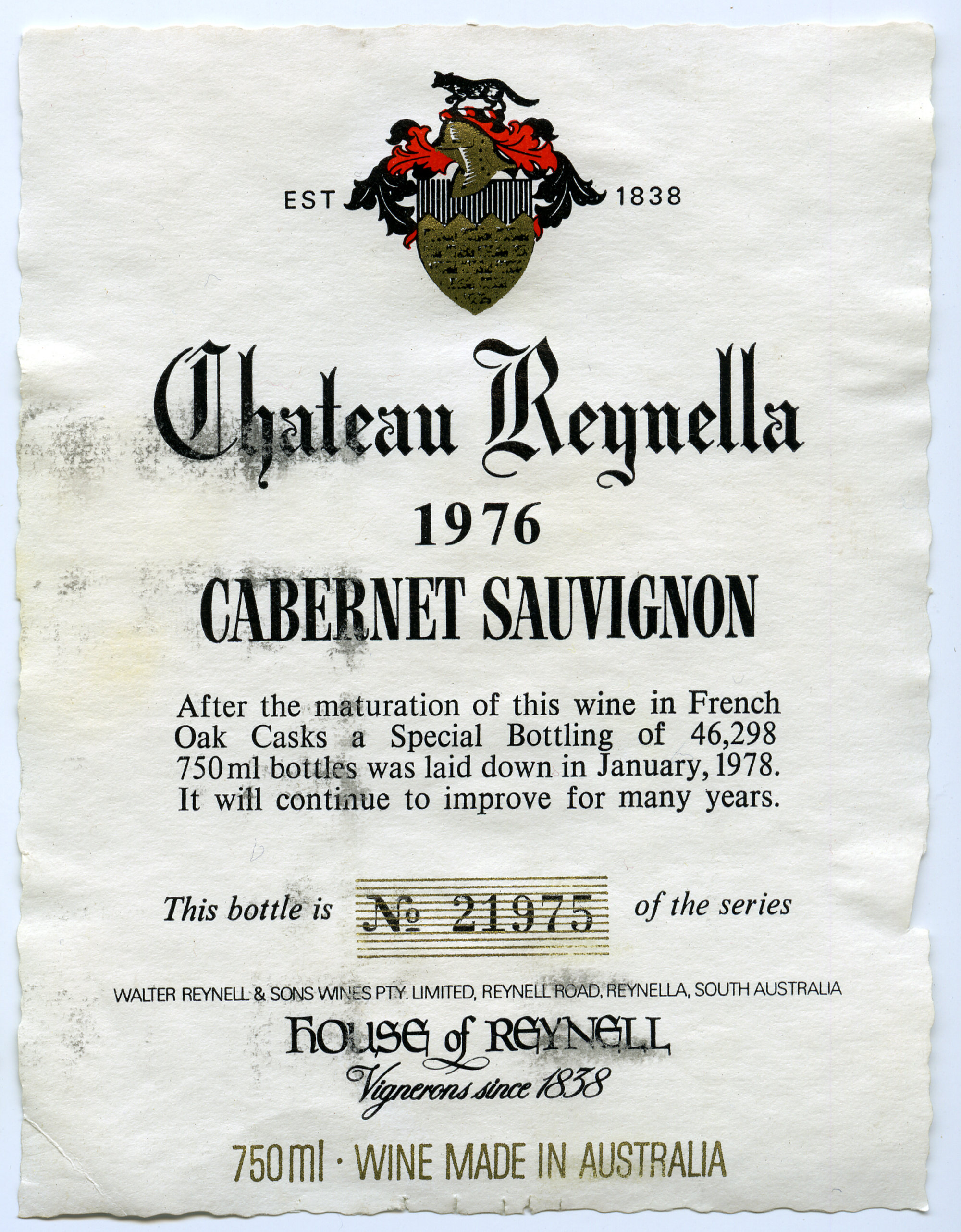 Reynell Cabernet Sauvignon Label (1976) (1976). Living Histories, accessed 16/04/2026, https://livinghistories.newcastle.edu.au/nodes/view/63630