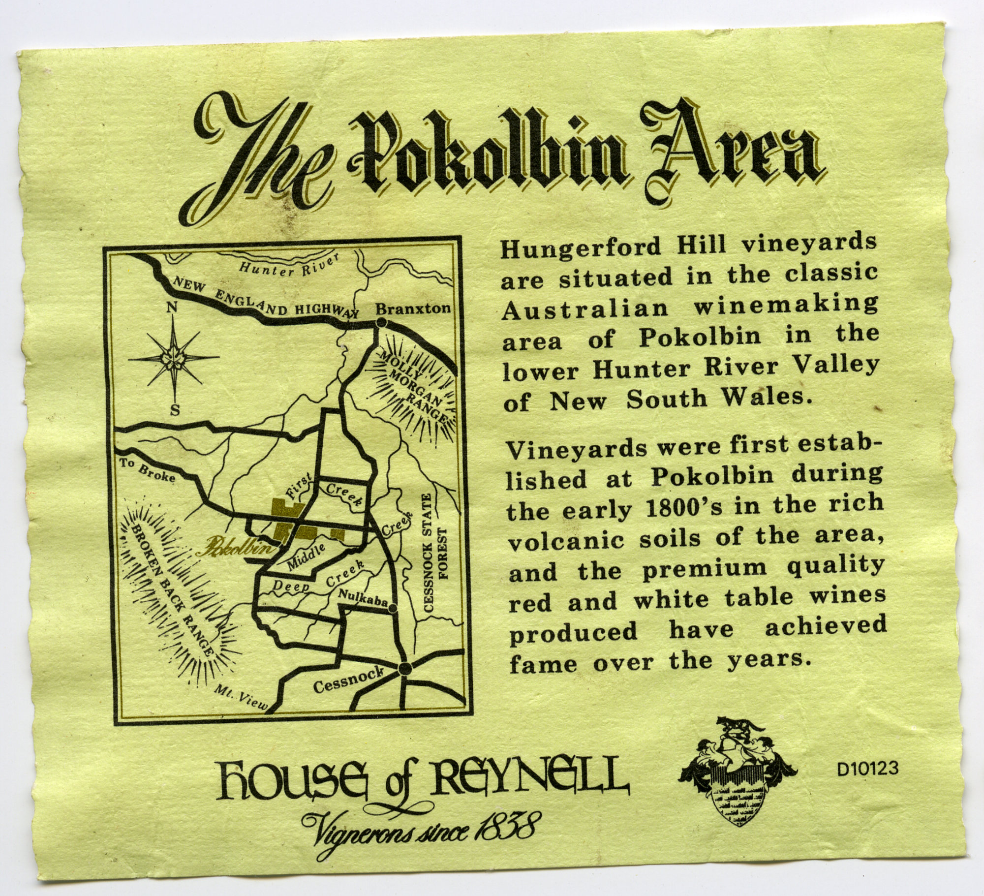 Label reads: "The Pokolbin area. Hunterford Hill vineyards are situated in the classic Australian winemaking area of Pokolbin in the lower Hunter River Valley of New South Wales. Vineyards were first established at Pokolbin during the early 1800's in the rich volcanic soils of the area, and the premium quality red and white table wines produced have achieved fame over the years. House of Reynell. Vignerons since 1838. D10123."