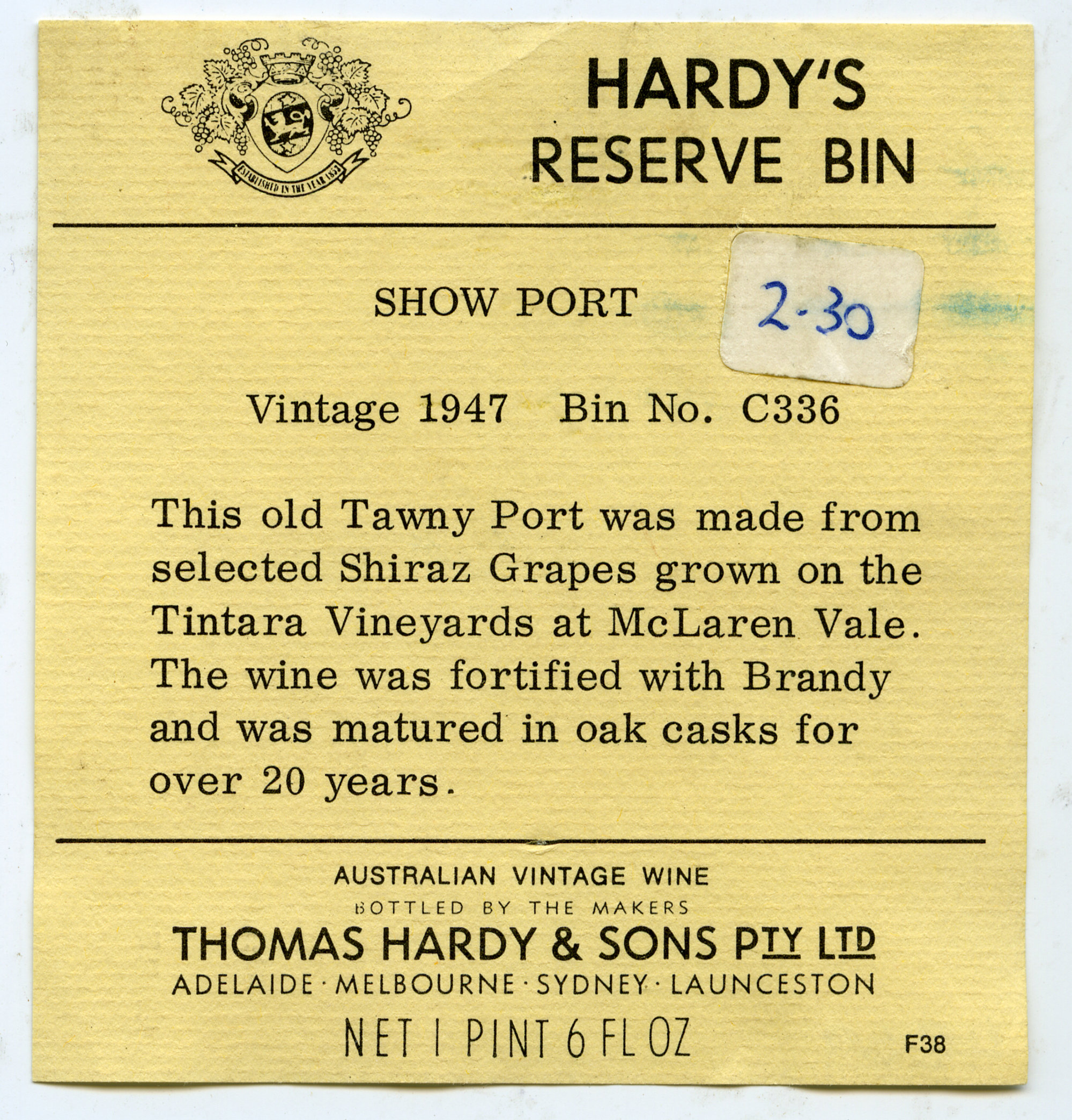 Label reads: "Hardy's Reserve Bin. Show Port. Vintage 1947. Bin No. C336. This old tawny port was made from selected Shiraz grapes grown on the Tintara Vineyards at McLaren Vale. This wine was fortified with Brandy and was matured in oak casks for over 20 years. Australian Vintage Wine. Bottled by the Makers. Thomas Hardy and Sons Pty Ltd. Adelaide. Melbourne. Sydney. Launceston. Net 1 pint 6 fl oz. F38."