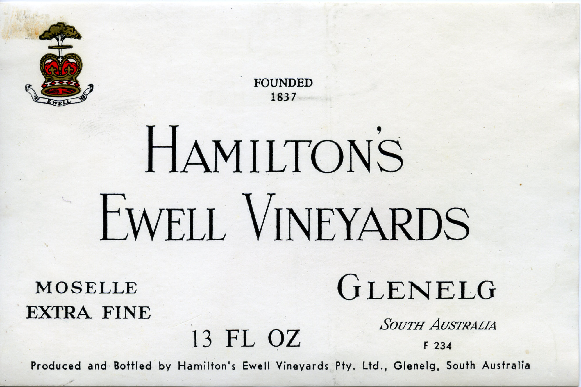 Label reads: "Founded 1837. Hamilton's Ewell Vineyards. Moselle Extra Fine. Glenelg. 13 Fl Oz. South Australia. F234. Produced and bottled by Hamilton's Ewell Vineyards Pty. Ltd., Glenelg, South Australia."