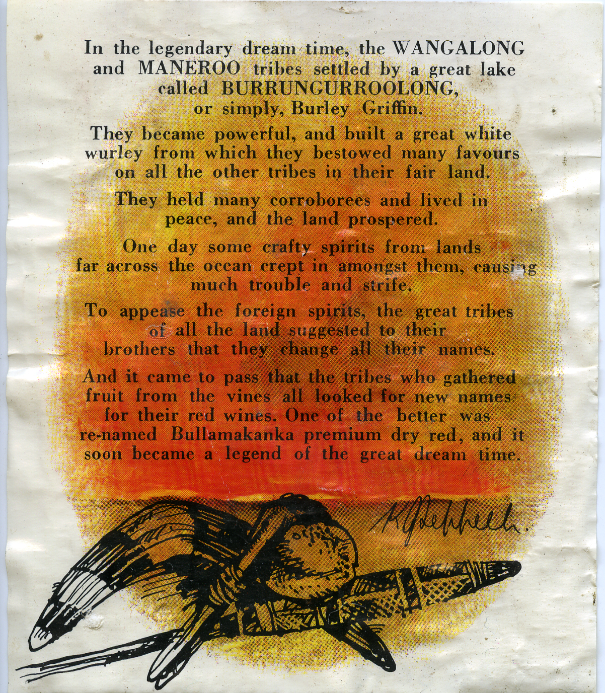 Label reads: "In the legendary dream time, the Wangalong and Maneroo tribes settled by a great lake called Burrungurroolong, or simply, Burley Griffin..."