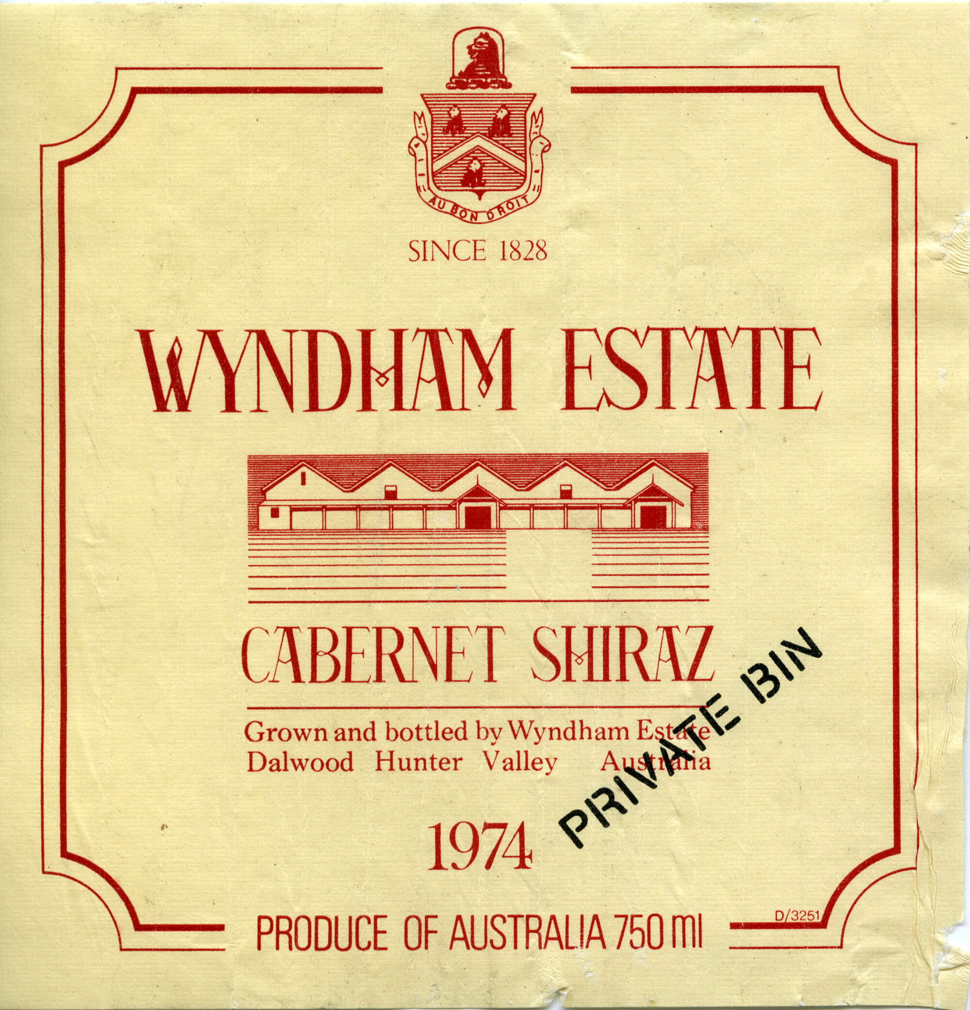 Date1974Wine MakerSteve MeyerWineryWyndham Estate WinesCollectorMorse, AllanType of WineCabernet Shiraz DescriptionLabel reads: "Since 1828 Wyndham Estate CABERNET SHIRAZ Grown and bottled by Wyndham Estate Dalwood Hunter Valley Australia 1974 Produce of Australia 750ml"