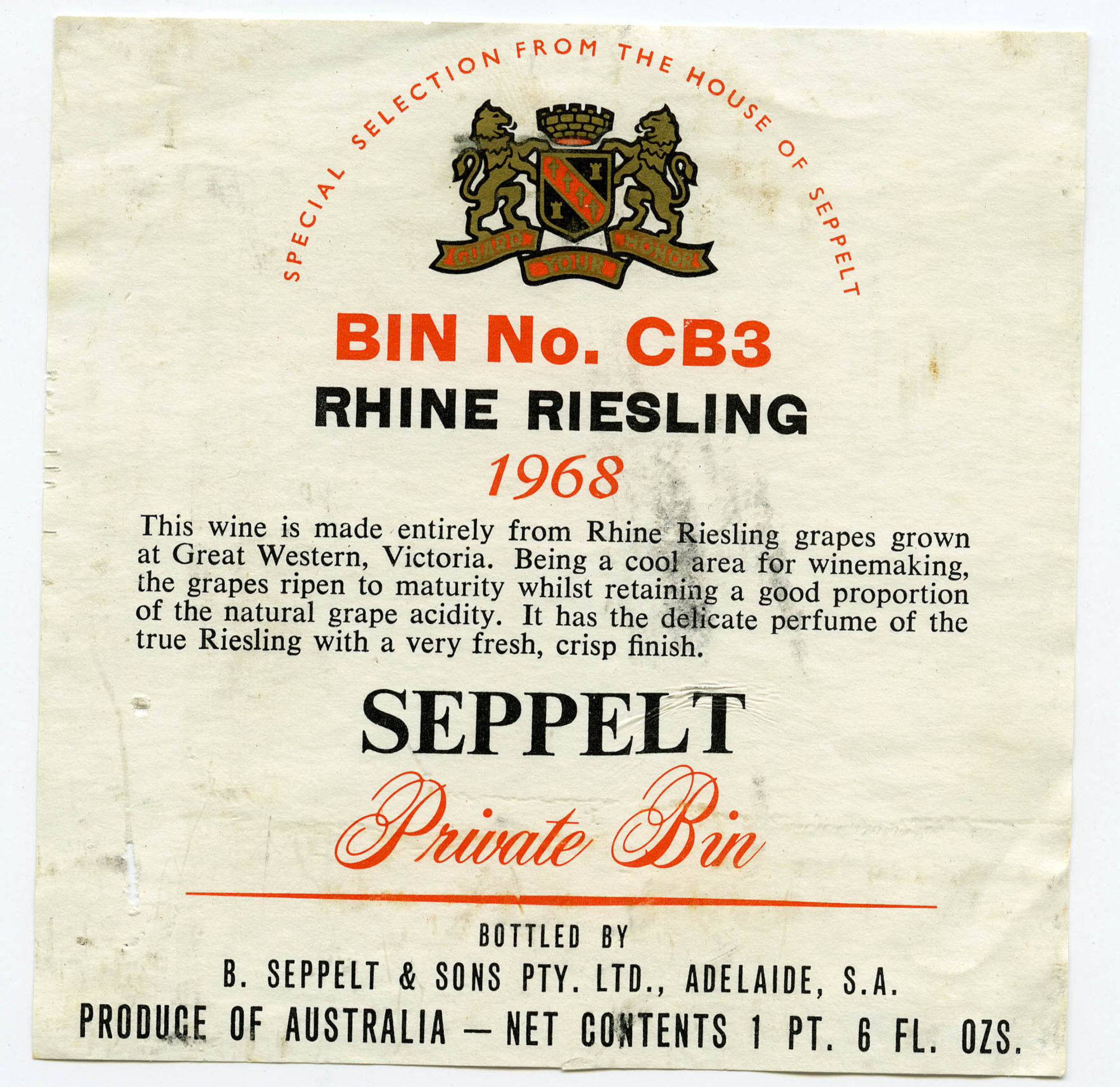 Label reads: "Special Selection from the house of Seppelt Bin No. CB3 RHINE RIESLING 1968 This wine is made entirely from Rhine Riesling grapes grown at Great Western Victoria Being a cool area for winemaking the grapes ripen to maturity whilst retaining a good proportion of natural grape acidity. It has the delicate perfume of the true Riesling with a very fresh crisp finish. SEPPELT Private Bin Bottled by B. Seppelt and Sons Limited Adelaiade S.A. Produce of Australia Contents 1 pt 6 Fl ozs"