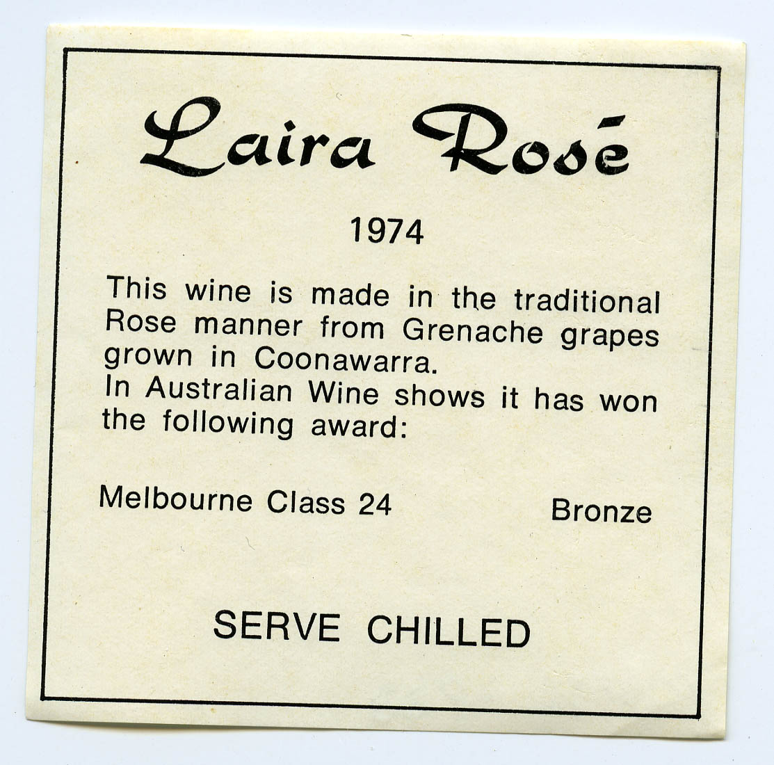 Laira Rose Vineyard Coonawarra Label (1974) (1974). Living Histories, accessed 06/03/2026, https://livinghistories.newcastle.edu.au/nodes/view/63858