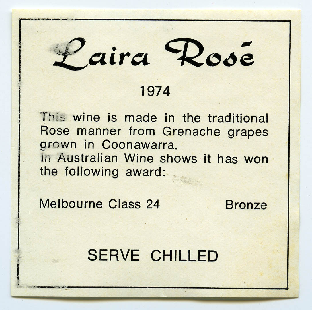 Laira Rose Vineyard Coonawarra Label (1974) (1974). Living Histories, accessed 17/02/2026, https://livinghistories.newcastle.edu.au/nodes/view/63883