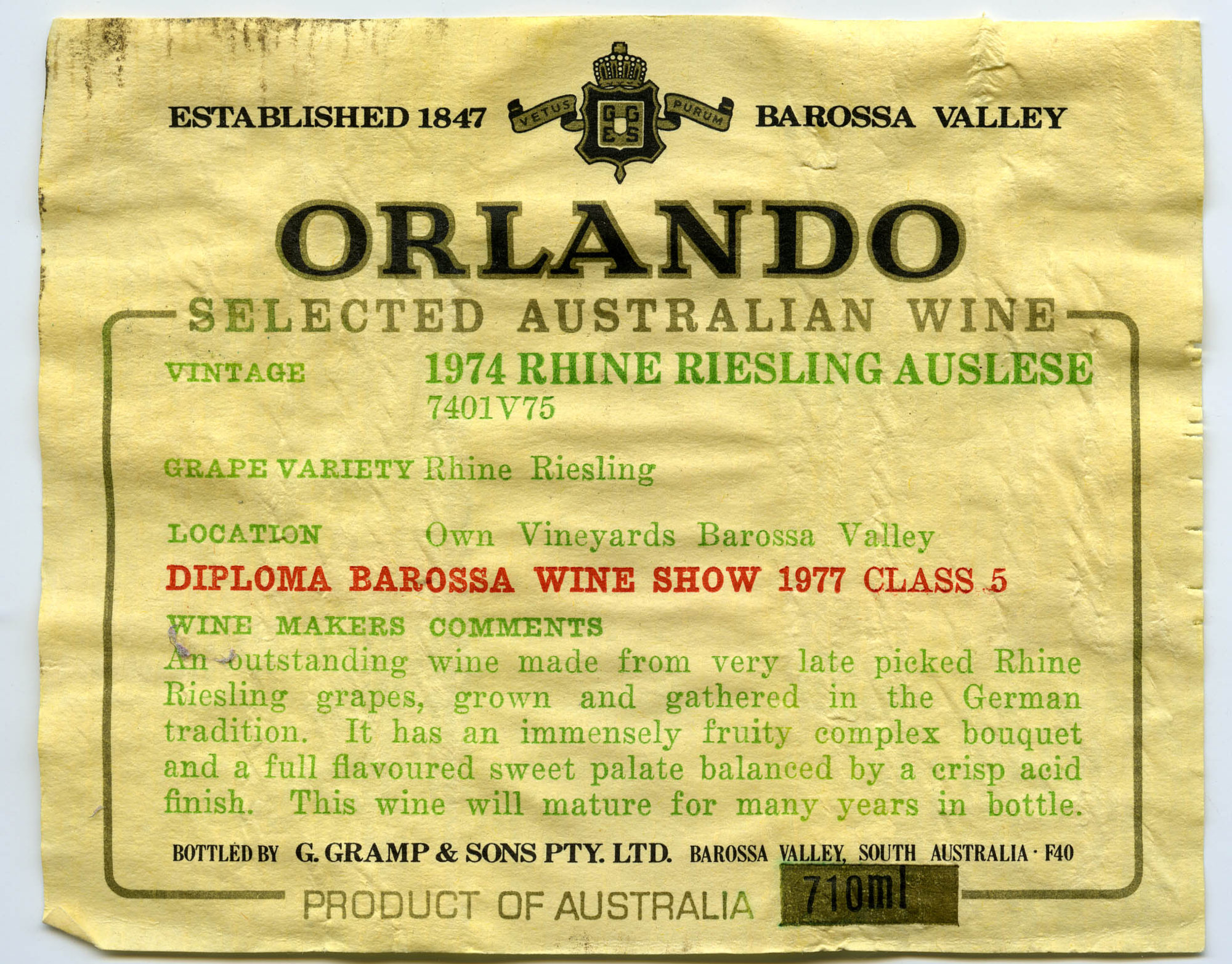 Label reads: "Established 1847 Barossa Valley Orlando Selected Australian Wine Vintage: 1974 Rhine Riesling Auslese 7401V75 Grape Variety: Rhine Riesling Location: Own Vineyards Barossa Valley Diploma Barossa Wine Show 1977 Class 5 Winemakers Comments: An outstanding wine made from very late picked Rhine Riesling grapes grown and gathered in the german tradition It has an immensely fruity complex bouquet and a full flavoured sweet palate balanced by a crisp acid finish. This wine will mature for many years in bottle bottled by G Gramp and Sons Pty. Ltd. Barossa Valley South Australia Product of Australia 710ml"