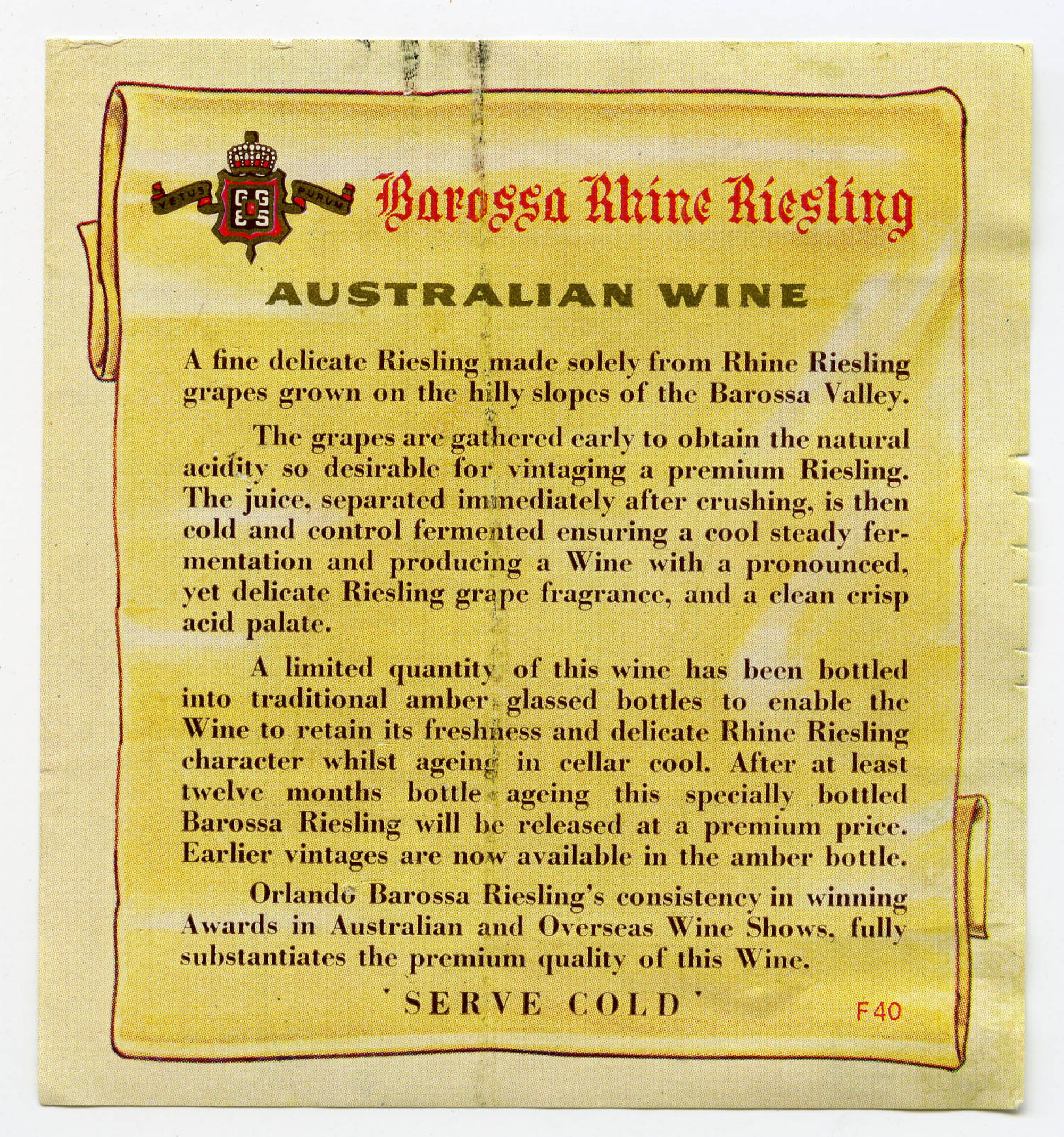 Label reads: Barossa Riesling Australian Wine A fine delicate Riesling made solely from Rhine Riesling grapes grown on the hilly slopes of the Barossa Valley The grapes are gathered early to obtain the natural acidity so desirable for vintaging a premium Riesling The juice seperated immediately after crushing is then cold and control fermented ensuring a cool steady fermentation and producing a Wine with a clean crisp acid palate A limited quantity of this wine has been bottled into traditional amber glassed bottles to enable the Rhine Reisling character whilst ageing in cellar cool. After at least twelve months bottle ageing this specially bottled Barossa Riesling will be released at a premium price Earlier vintages are now available in the amber bottle Orlando Barossa Riesling's consistency in winning Awards in Australian and Overseas Wine Shows fully substantiates the premium quality of this Wine Serve Cold"