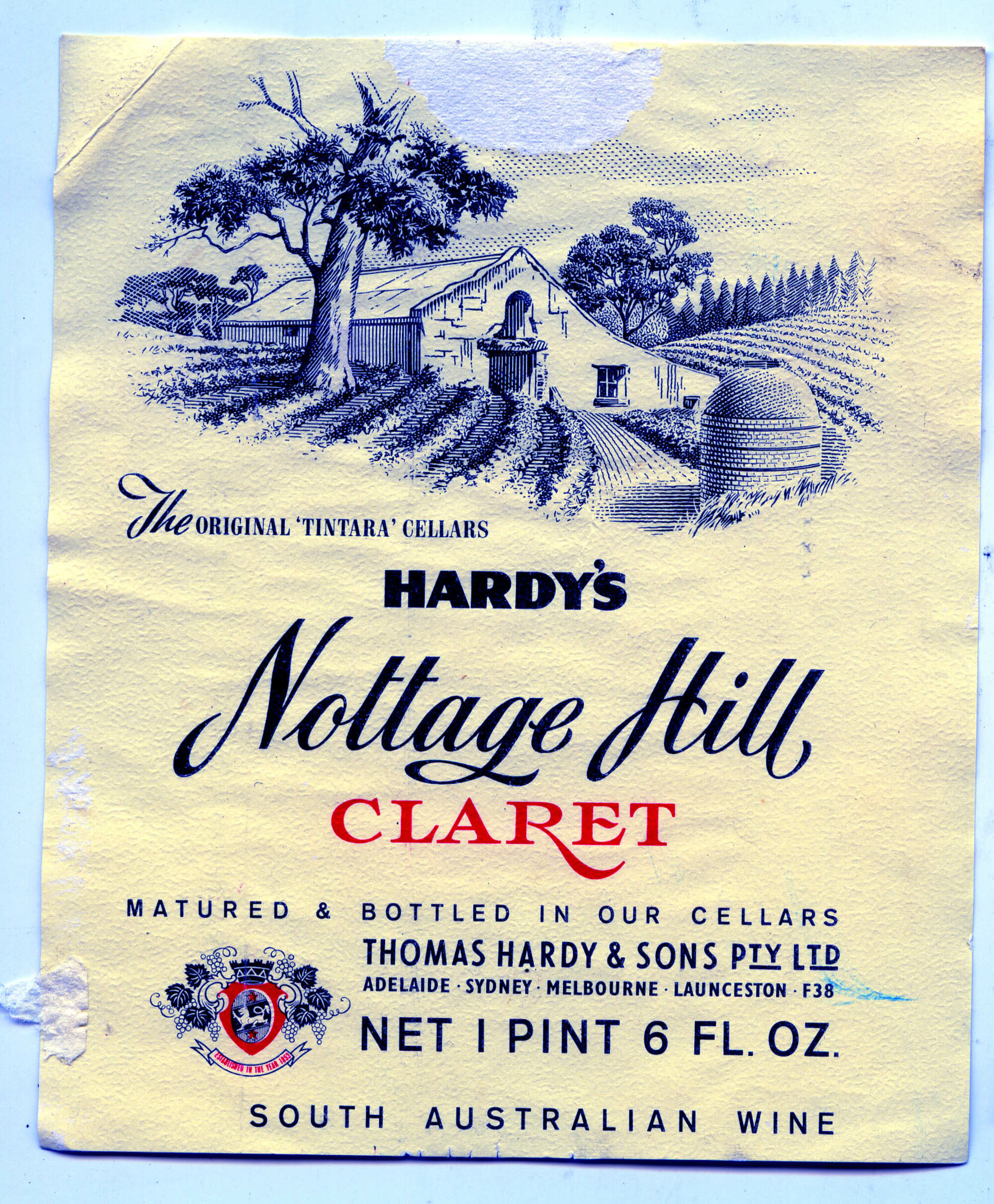 Wine MakerRoger Warren, Dick Heath and Brian CroserWineryTintara WineryCollectorMorse, AllanType of WineNottage HillLanguageEnglishDescriptionLabel reads: "The original 'Tintara' Cellars Hardy's NOTTING HILL CLARET Matured and Bottled in our Cellars Thomas Hardy and Sons Pty Ltd. Adelaide Sydney Melbourne Launceston Net 1 Pint 6 Fl. Oz. South Australian wine"