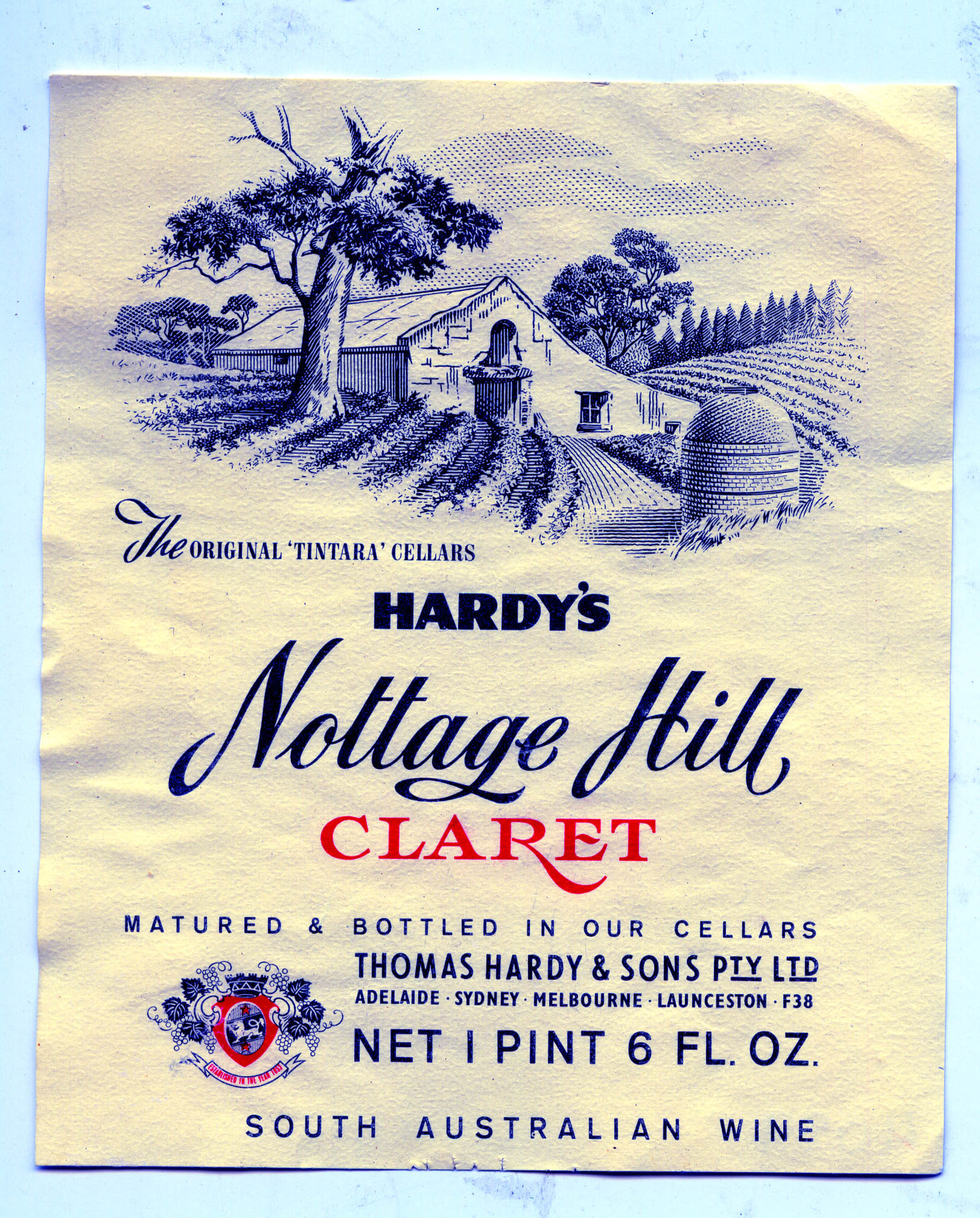 Wine MakerRoger Warren, Dick Heath and Brian CroserWineryTintara WineryCollectorMorse, AllanType of WineNottage HillLanguageEnglishDescriptionLabel reads: "The original 'Tintara' Cellars Hardy's NOTTING HILL CLARET Matured and Bottled in our Cellars Thomas Hardy and Sons Pty Ltd. Adelaide Sydney Melbourne Launceston Net 1 Pint 6 Fl. Oz. South Australian wine"