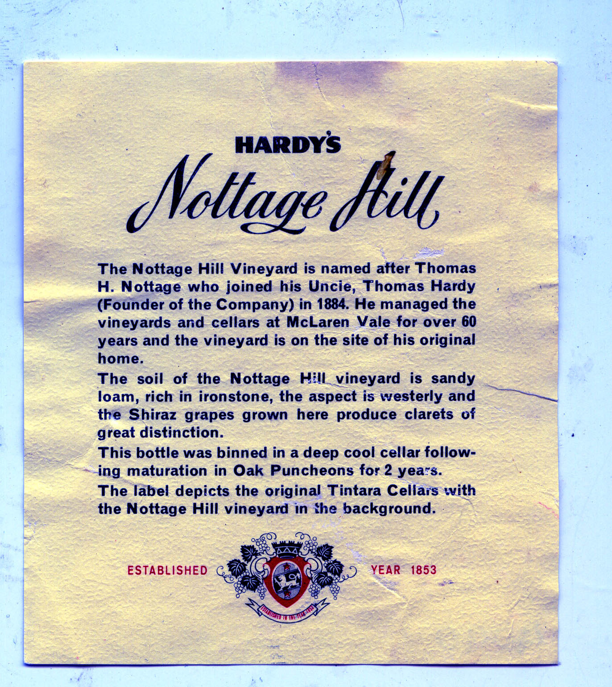 Wine MakerRoger Warren, Dick Heath and Brian CroserWineryTintara WineryCollectorMorse, AllanType of WineNottage HillLanguageEnglishDescriptionLabel reads: "Hardy's Nottage Hill The Nottage Vineyard is named after Thomas H. Nottage who joined his Uncle, Thomas Hardy (Founder of the Company) in 1884. He managed the vineyards and cellars at McLaren Vale for over 60 years and the vineyard is on the site of his original home. The soil of the Nottage Hill vineyard is sandy loam, rich in ironstone, the aspect is westerly and the Shiraz grapes grown here produce clarets of great distinction. This bottle was binned in a deep cool cellar following maturation in Oak Puncheons for 2 years. The label depicts the original Tintara Cellars with the Nottage Hill vineyard in the background. Established Year 1853"