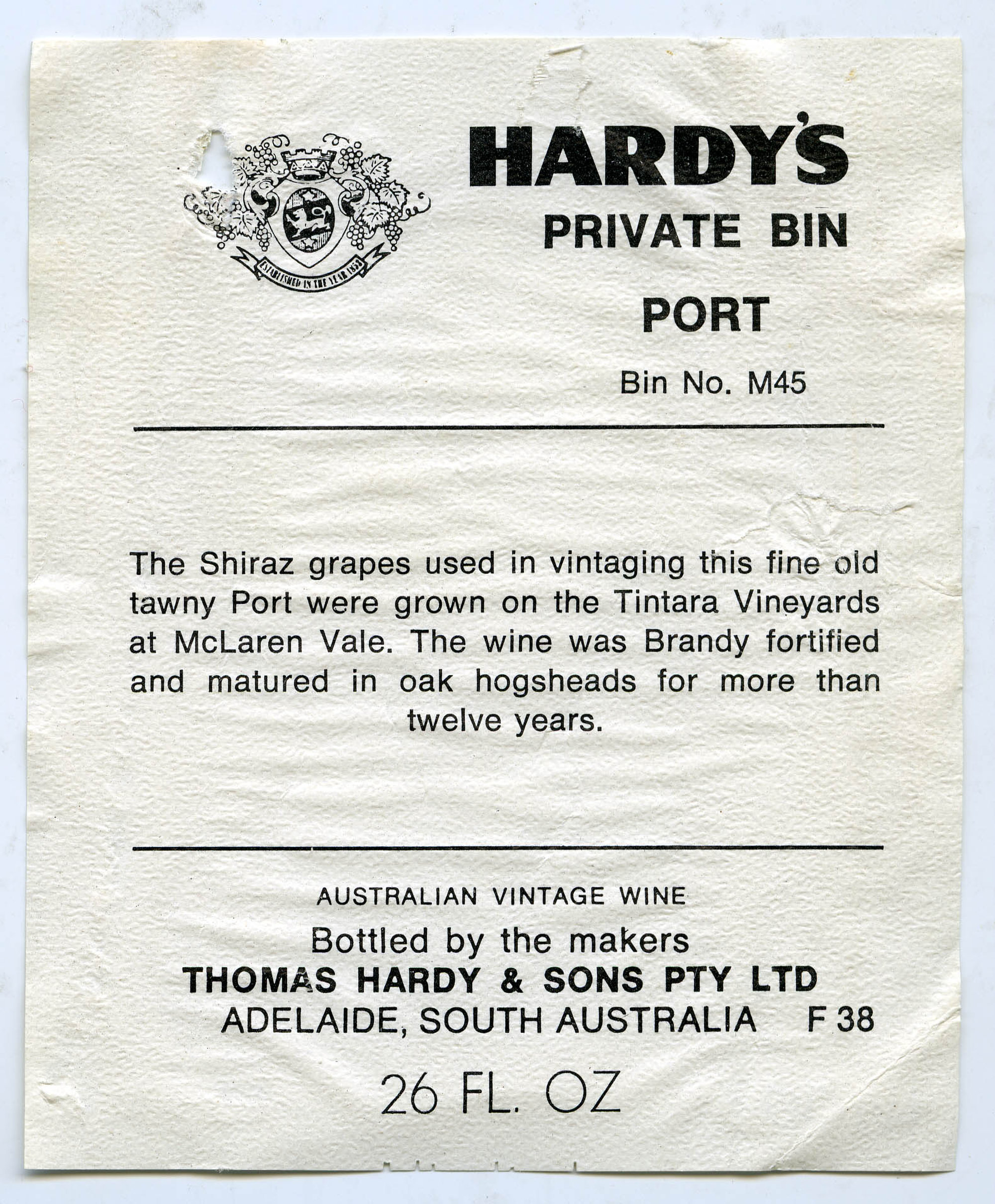 Wine MakerRoger Warren, Dick Heath and Brian CroserWineryTintara WineryCollectorMorse, AllanType of WinePrivate Bin PortLanguageEnglishDescriptionLabel reads: "Hardy's Private Bin PORT Bin No. M45 The Shiraz grapes used in vintaging this fine old tawny Port were grown on Tintara Vineyards at McLauren Vale. The Wine was Brandy fortified and matured in oak hogsheads for more than twelve years. Australian Vintage Wine Bottled by the makers Thomas Hardy and Sons Pty. Ltd. Adelaide, South Australia 26 Fl. Oz"