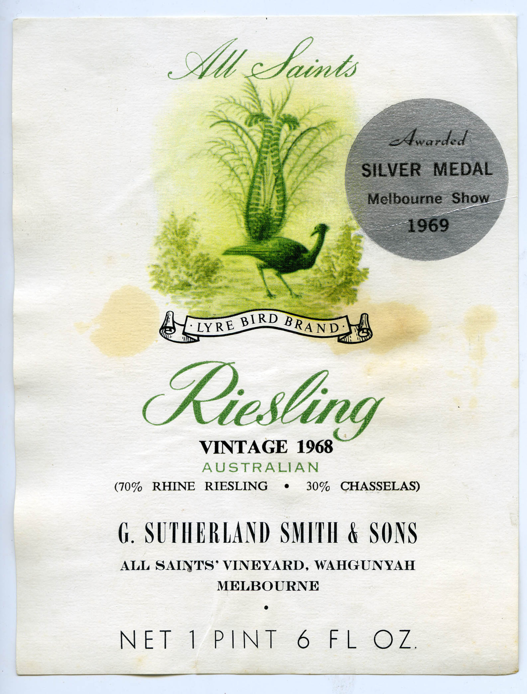 Label reads: "All Saints RIESLING Vintage 1968 Australian This wine was made from 70% Rhine Riesling and 30% Chassels grapes grown at Wahgunyah N.E. Victoria and has a fragrant bouquet a delicate soft middle palate and a crisp clean finish G. Sutherland Smith and Sons All Saints Vineyard Wahgunyah Melbourne Net 1 Pint 6 Fl Oz"