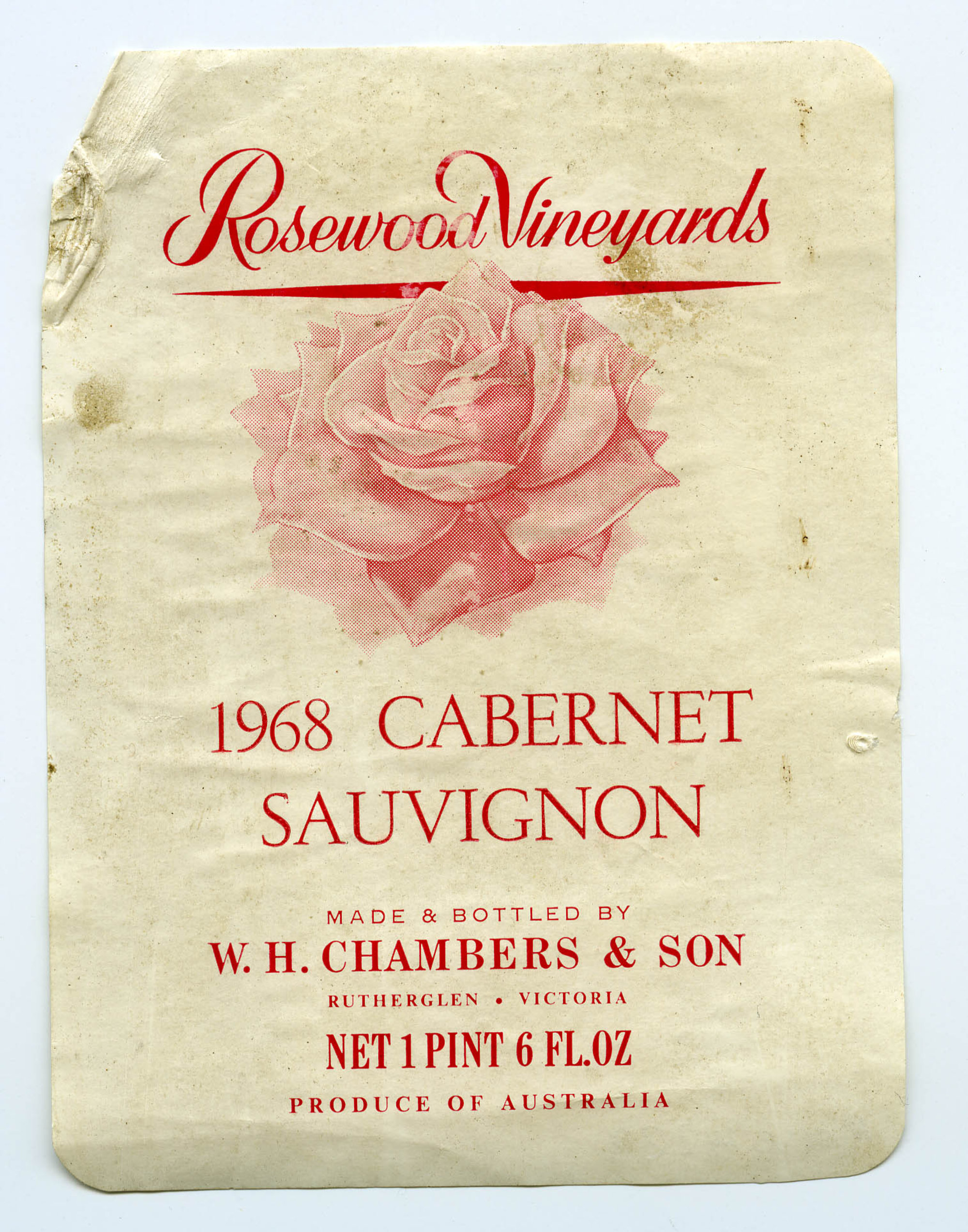 Label reads: "Rosewood Vineyards 1968 CABERNET SAUVIGNON Made and Bottled by W.H. Chambers and Son Rutherglen Victoria Net 1 Pint 6 Fl. Oz Produce of Australia"