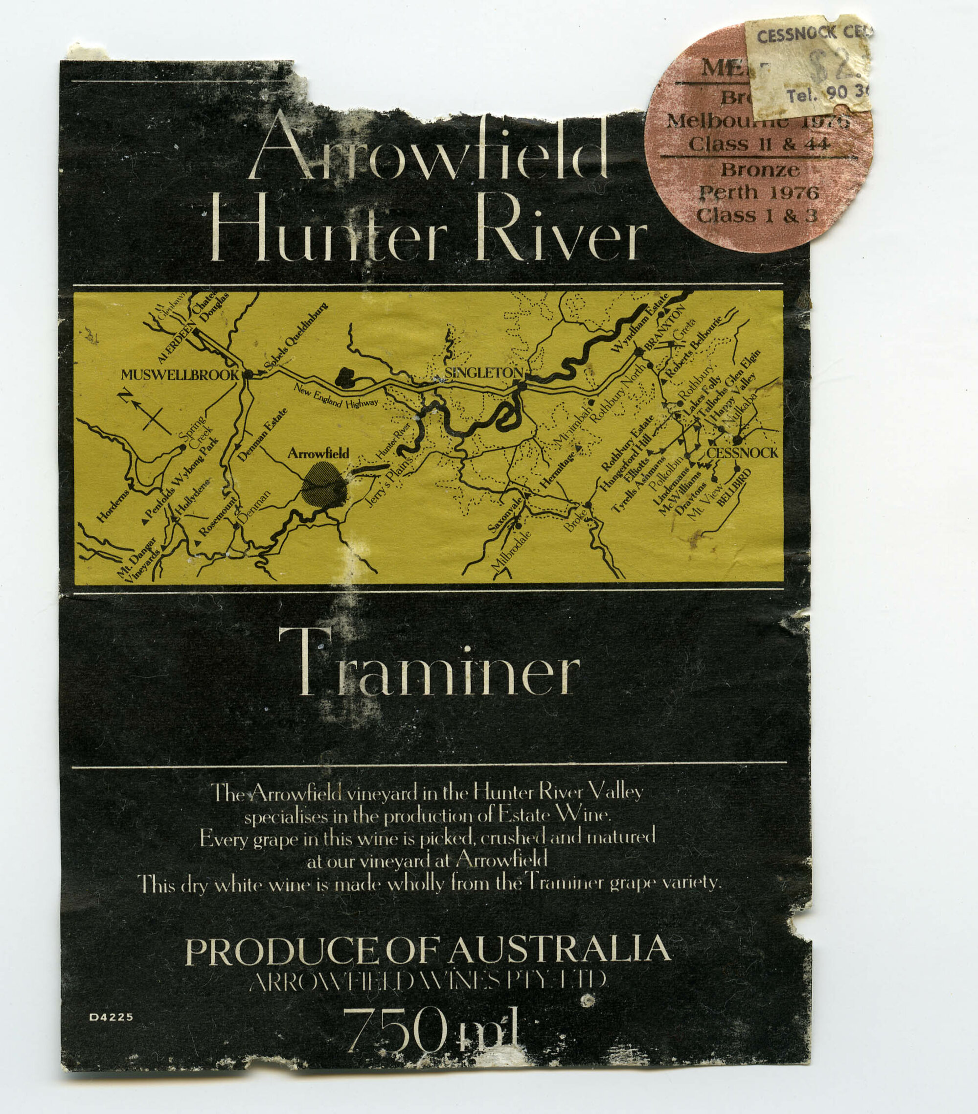 Label reads: "Arrowfield Hunter River TRAMINER The Arrowfield vineyard in the Hunter River Valley specialies in the production of Estate Wine Every grape in this wine is picked, crushed and matured at our vineyard at Arrowfield This dry white wine is made wholly from the Traminer grape variety Produce of Australia Arrowfield Wines Pty. Ltd. 750ml"