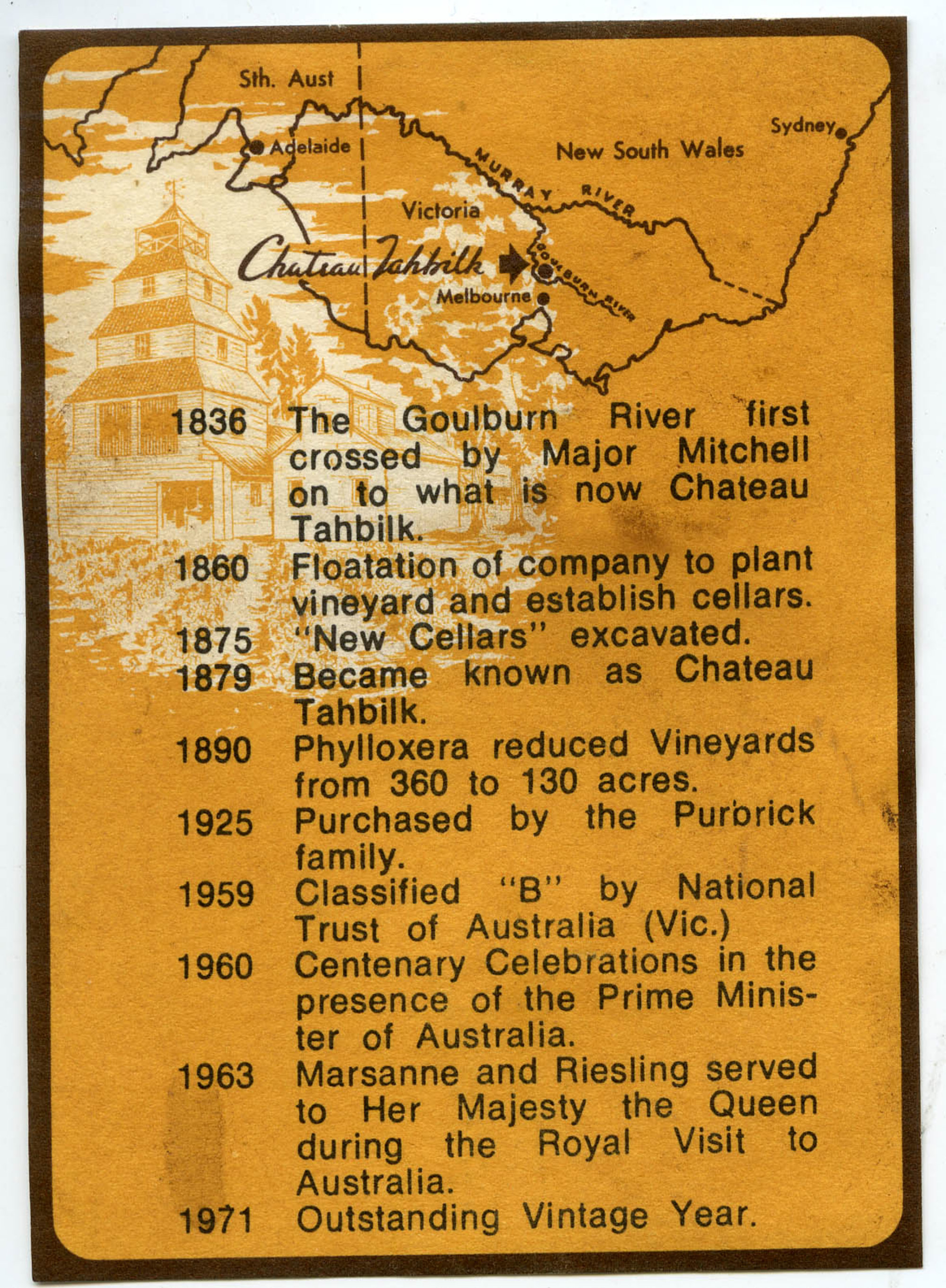 Wine MakerAlister PurbrickWineryChateau TahbilkCollectorMorse, AllanLanguageEnglishDescriptionLabel reads: "1836 The Golbourn first crossed by Major Mitchell onto what is now Chateau Tahbilk 1860 Flotation of Company to plant vineyard, and establish cellars 1875"New Cellars"excavated 1879 Became known as as Chateau Tahbilk. 1890 Phylloxera reduced vineyard from 360 to 130 acres. 1925 Purchased by the Purbrick Family1959 Clasified "B" by National Trust of Australia (Vic.) 1960 Centenary Celebration in the presence of the Prime Minister of Australia