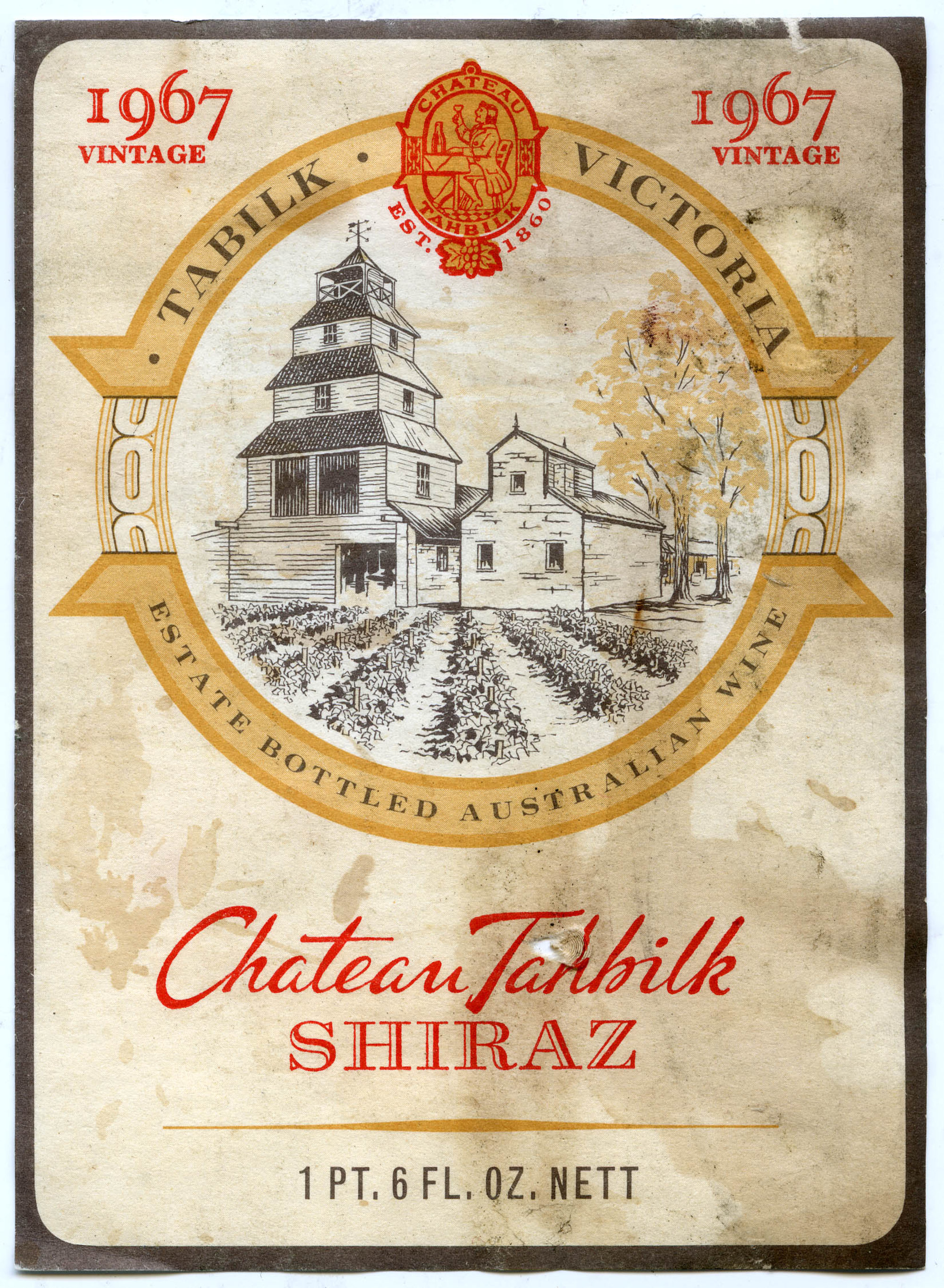 Label reads: "1967 Vintage Tahbilk Victoria Estate Bottled Australian Wine Chateau Tahbilk SHIRAZ 1 pint 6 fl oz Nett"