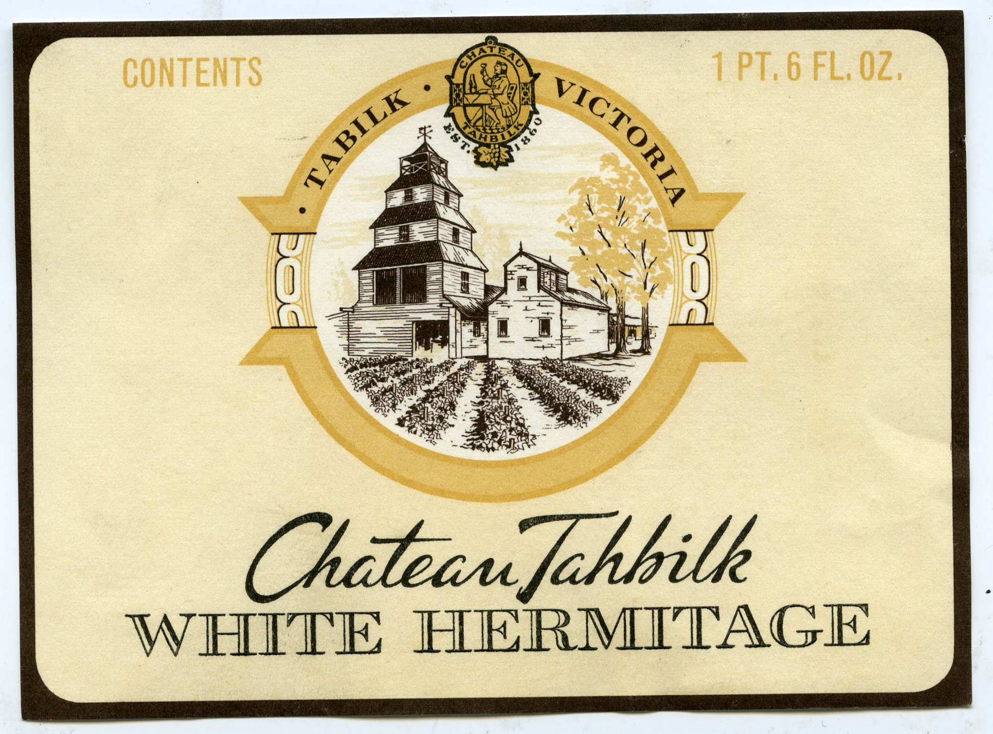 Label reads: "Contents 1 Pint 6 FL OZ. Chateau Tahbilk WHITE HERMITAGE