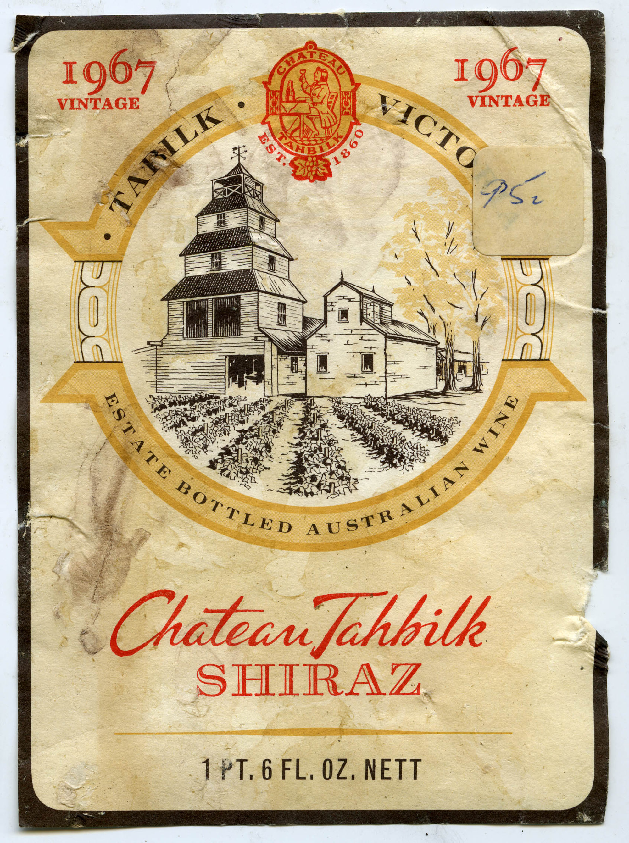 Label reads: "1967 Vintage Tahbilk Victoria Estate Bottled Australian Wine Chateau Tahbilk SHIRAZ 1 pint 6 fl oz Nett"