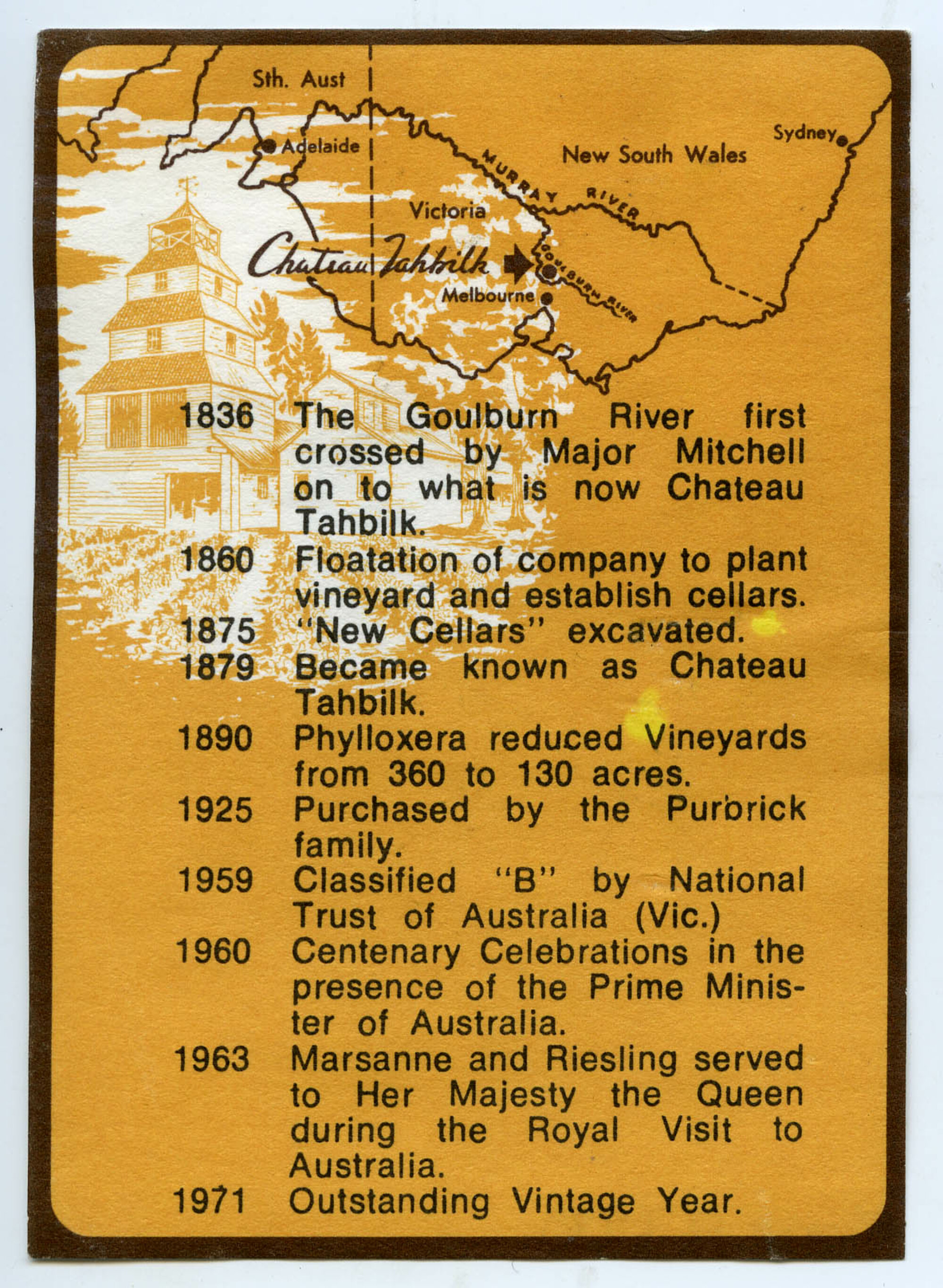 Wine MakerAlister PurbrickWineryChateau TahbilkCollectorMorse, AllanLanguageEnglishDescriptionLabel reads: "1836 The Golbourn first crossed by Major Mitchell onto what is now Chateau Tahbilk 1860 Flotation of Company to plant vineyard, and establish cellars 1875"New Cellars"excavated 1879 Became known as as Chateau Tahbilk. 1890 Phylloxera reduced vineyard from 360 to 130 acres. 1925 Purchased by the Purbrick Family1959 Clasified "B" by National Trust of Australia (Vic.) 1960 Centenary Celebration in the presence of the Prime Minister of Australia