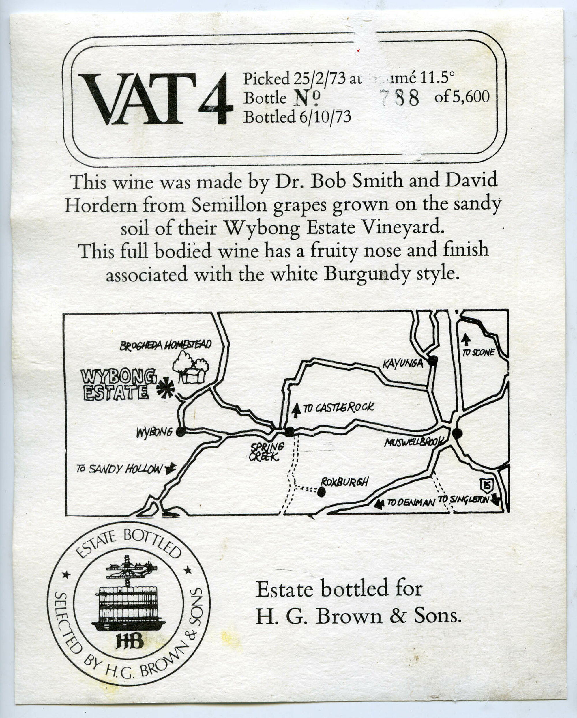 Label reads: "Vat 4 Picked 25/2/73 at Baume 11.5 Bottle No. 788 of 5,600 Bottled 6/10/73 This wine was made by Dr Bob Smith and David Hordern from Semillon grapes grown on the sandy soil of their Wybong Estate Vineyard This full bodied wine has a fruity nose and finish associated with the white burgundry style Estate bottled for H.G. Brown and Sons."
