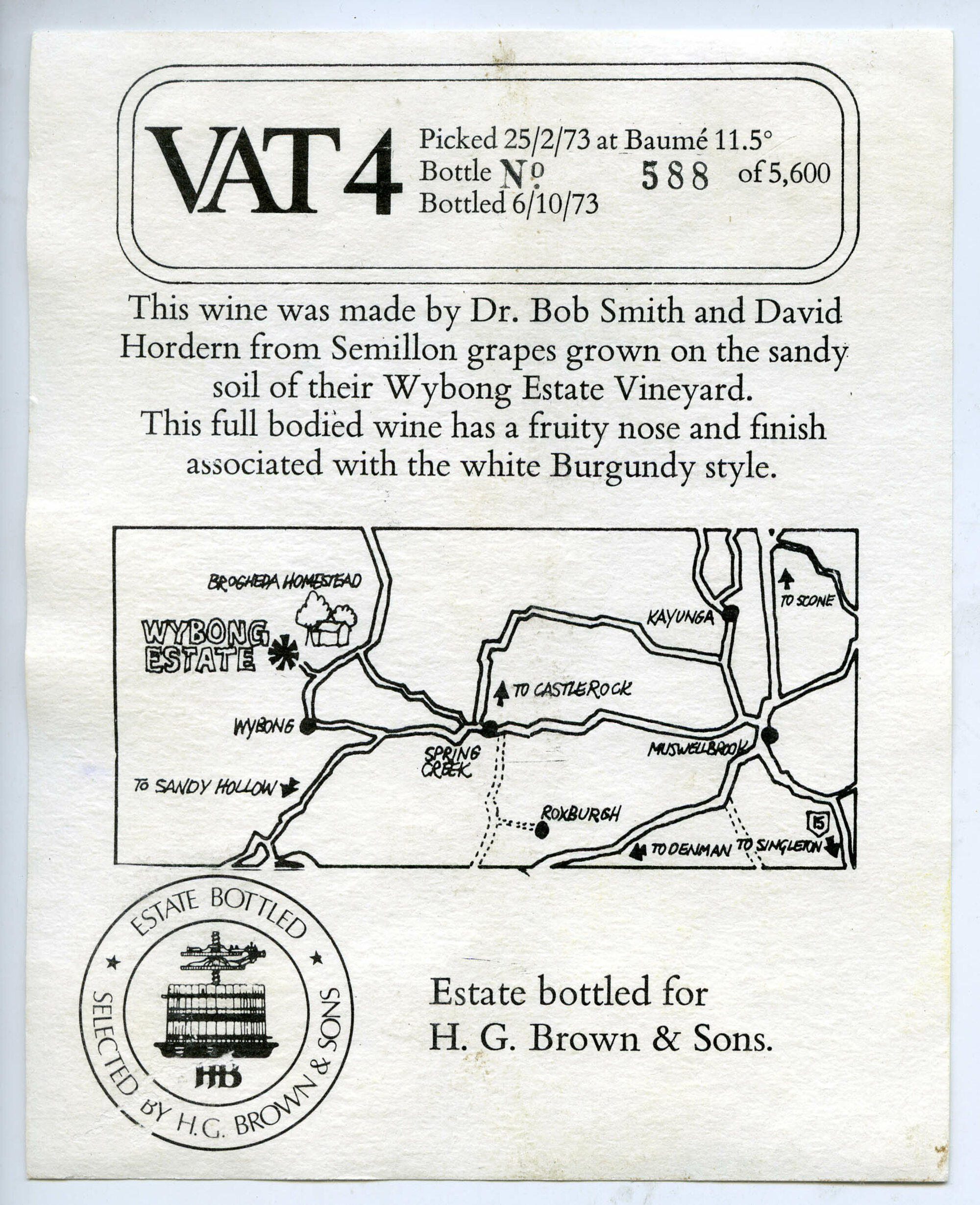 Label reads: "Vat 4 Picked 25/2/73 at Baume 11.5 Bottle No. 588 of 5,600 Bottled 6/10/73 This wine was made by Dr Bob Smith and David Hordern from Semillon grapes grown on the sandy soil of their Wybong Estate Vineyard This full bodied wine has a fruity nose and finish associated with the white burgundry style Estate bottled for H.G. Brown and Sons."