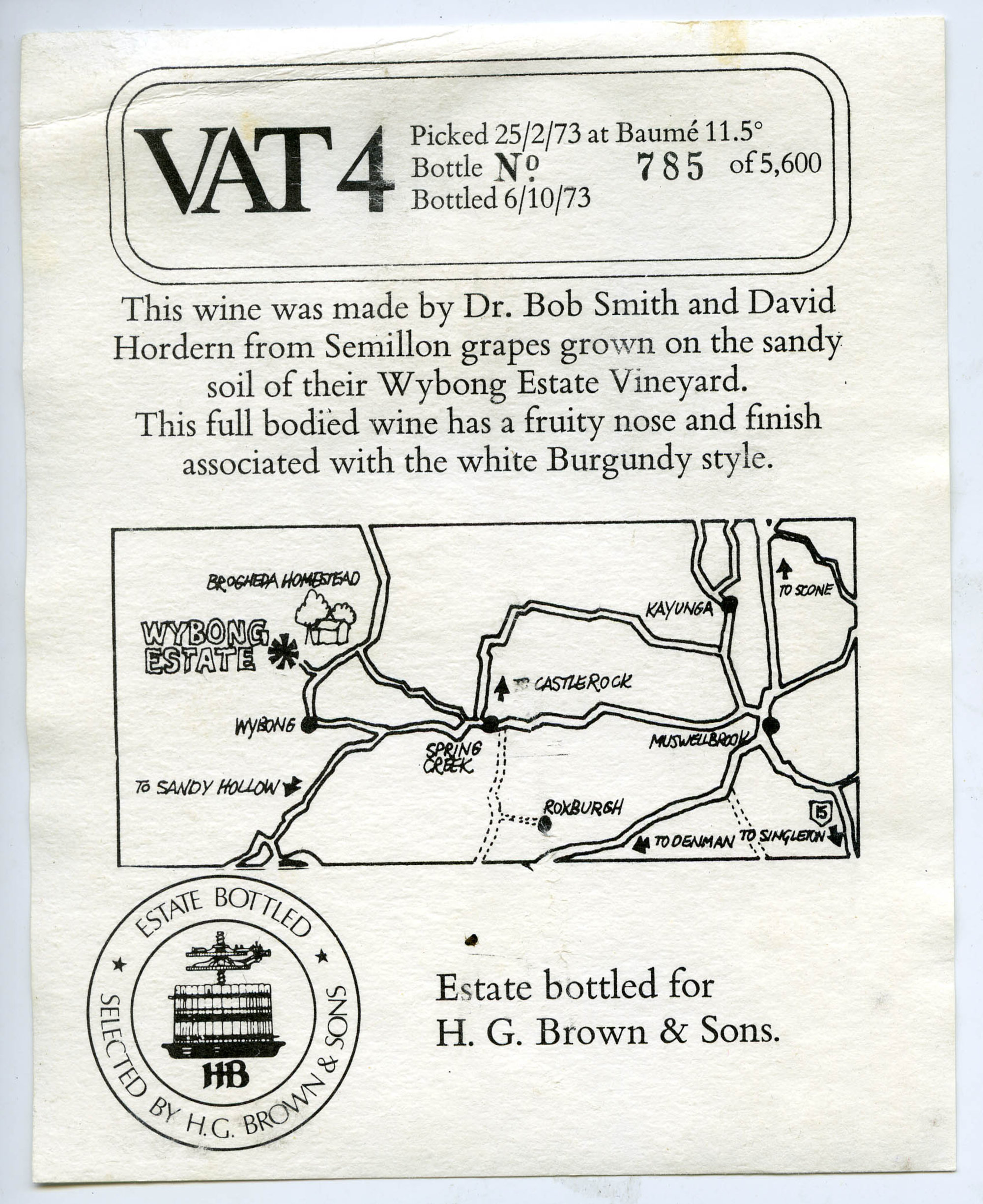 Label reads: "Vat 4 Picked 25/2/73 at Baume 11.5 Bottle No. 785 of 5,600 Bottled 6/10/73 This wine was made by Dr Bob Smith and David Hordern from Semillongrapes grown on the sandy soil of their Wybong Estate Vineyard This full bodied wine has a fruity nose and finish associated with the white burgundry style Estate bottled for H.G. Brown and Sons."