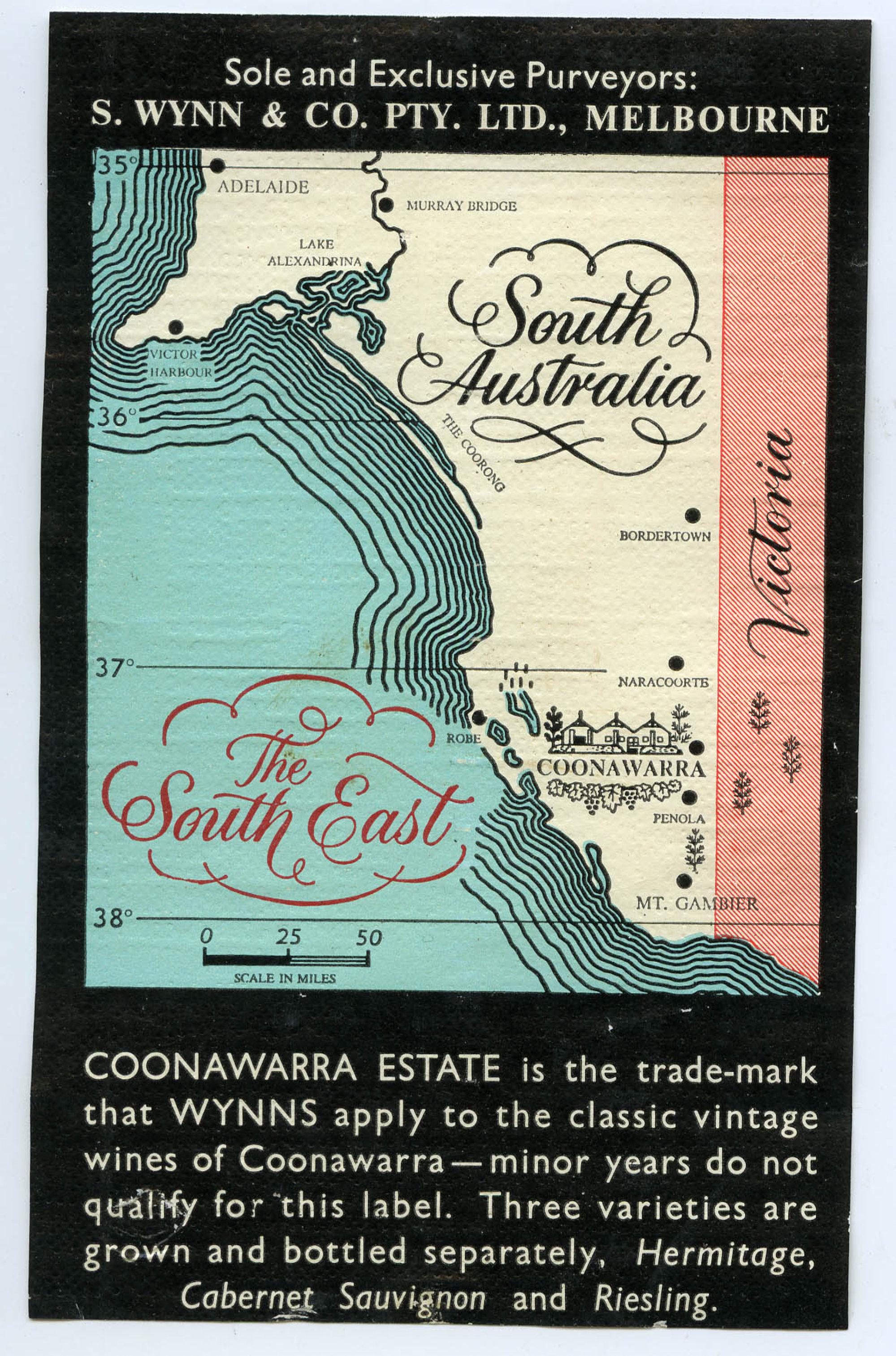 Wine MakerSue HodderWineryWynns Coonawarra EstateCollectorMorse, AllanLanguageEnglishDescriptionLabel reads: "Sole and Exclusive Purveyors: S Wynn and Co. Pty. Ltd. Melbourne Coonawarra Estate is the trade-mark that Wynns apply to the classic Vintage wines of Coonawarra - minoryears do not qualify for the label. Three varieties are grown and bottled separately, Hermitage, Cabernet Sauvignon and Riesling."