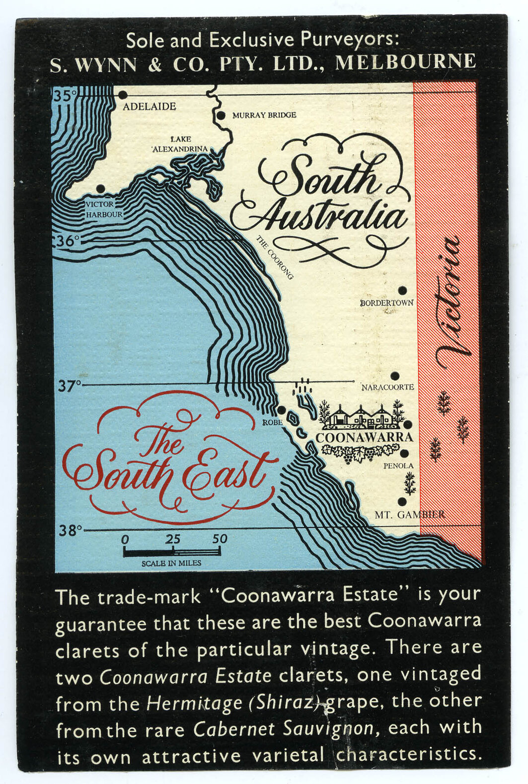 Wine MakerSue HodderWineryWynns Coonawarra EstateCollectorMorse, AllanLanguageEnglishDescriptionLabel reads: "Sole and Exclusive Purveyors: S Wynn and Co. Pty. Ltd. Melbourne The trade-mark "Coonawarra Estate"is your guarantee that these are the best Coonawarra clarets of the particular vintage. There are two Coonawarra Estate clarets, one vintaged from Hermitage (Shiraz) grape, the other from the rare Cabernet Sauvignon, each with its own attractive varietal characteristics."