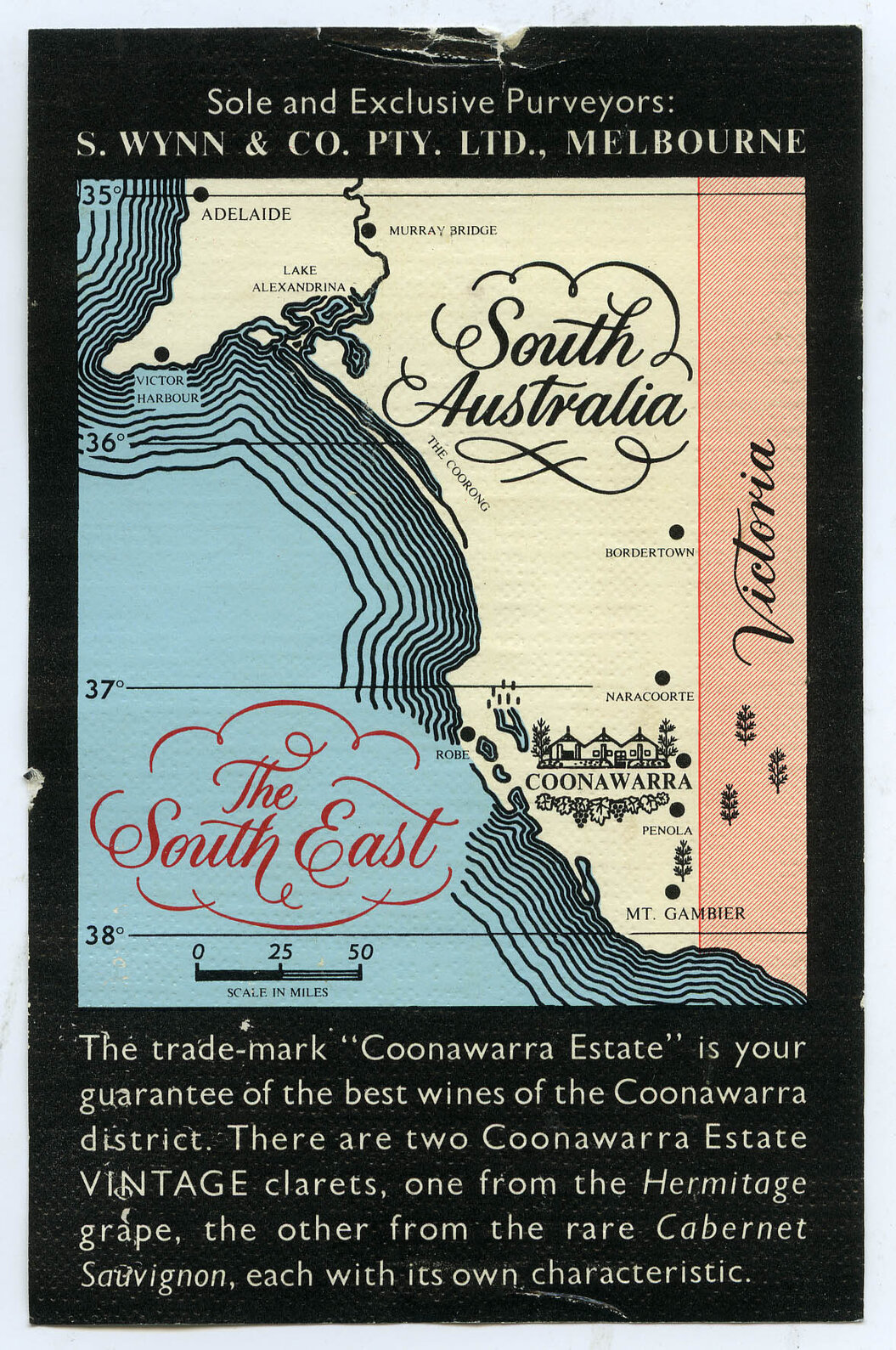 Wine MakerSue HodderWineryWynns Coonawarra EstateCollectorMorse, AllanLanguageEnglishDescriptionLabel reads: "Sole and Exclusive Purveyors: S Wynn and Co Pty. Ltd. Melbourne The trade-mark "Coonawarra Estate"is your guarantee of the best wines of the Coonawarra district. There are two Coonawarra Estate Vintage Clarets, one from Hermitage grape, the other from the rare Cabernet Sauvignon, each with its own characteristic."