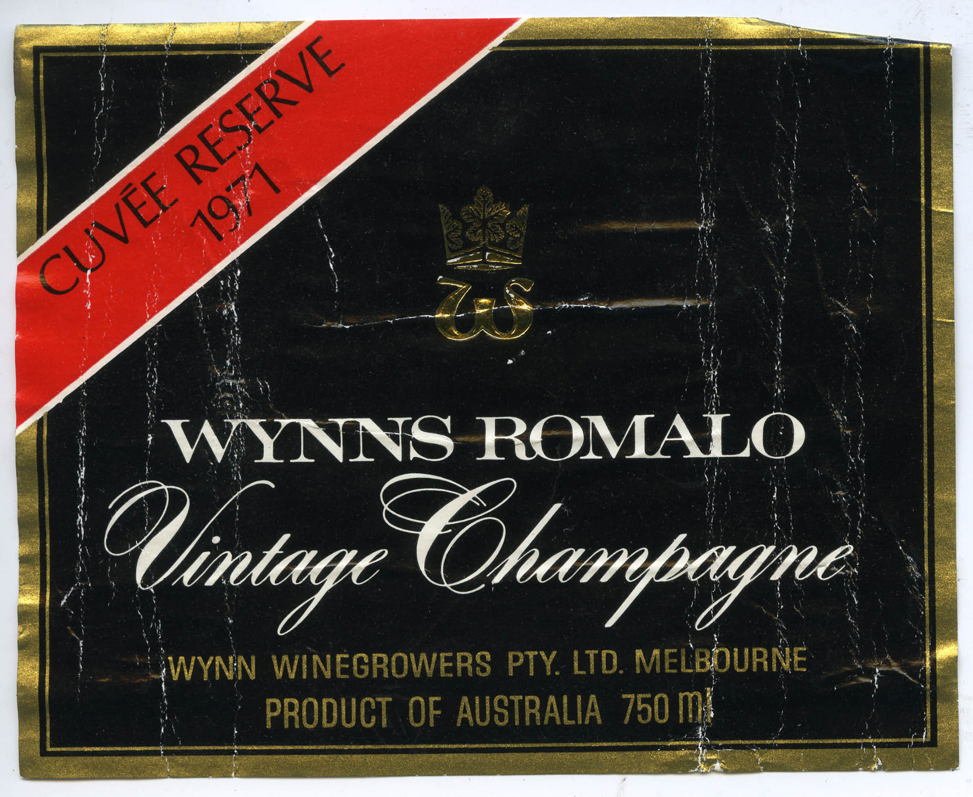Label reads: "Cuvee Reserve 1971 Wynns Romalo Vintage Champagne Wynn Winegrowers Pty. Ltd. Melbourne Product of Australia 750ml"