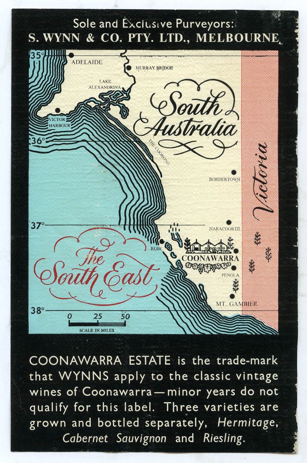 Wine MakerSue HodderWineryWynns Coonawarra EstateCollectorMorse, AllanLanguageEnglishDescriptionLabel reads: "Sole and Exclusive Purveyors: S Wynn and Co. Pty. Ltd. Melbourne Coonawarra Estate is the trade-mark that Wynns apply to the classic Vintage wines of Coonawarra - minoryears do not qualify for the label. Three varieties are grown and bottled separately, Hermitage, Cabernet Sauvignon and Riesling."