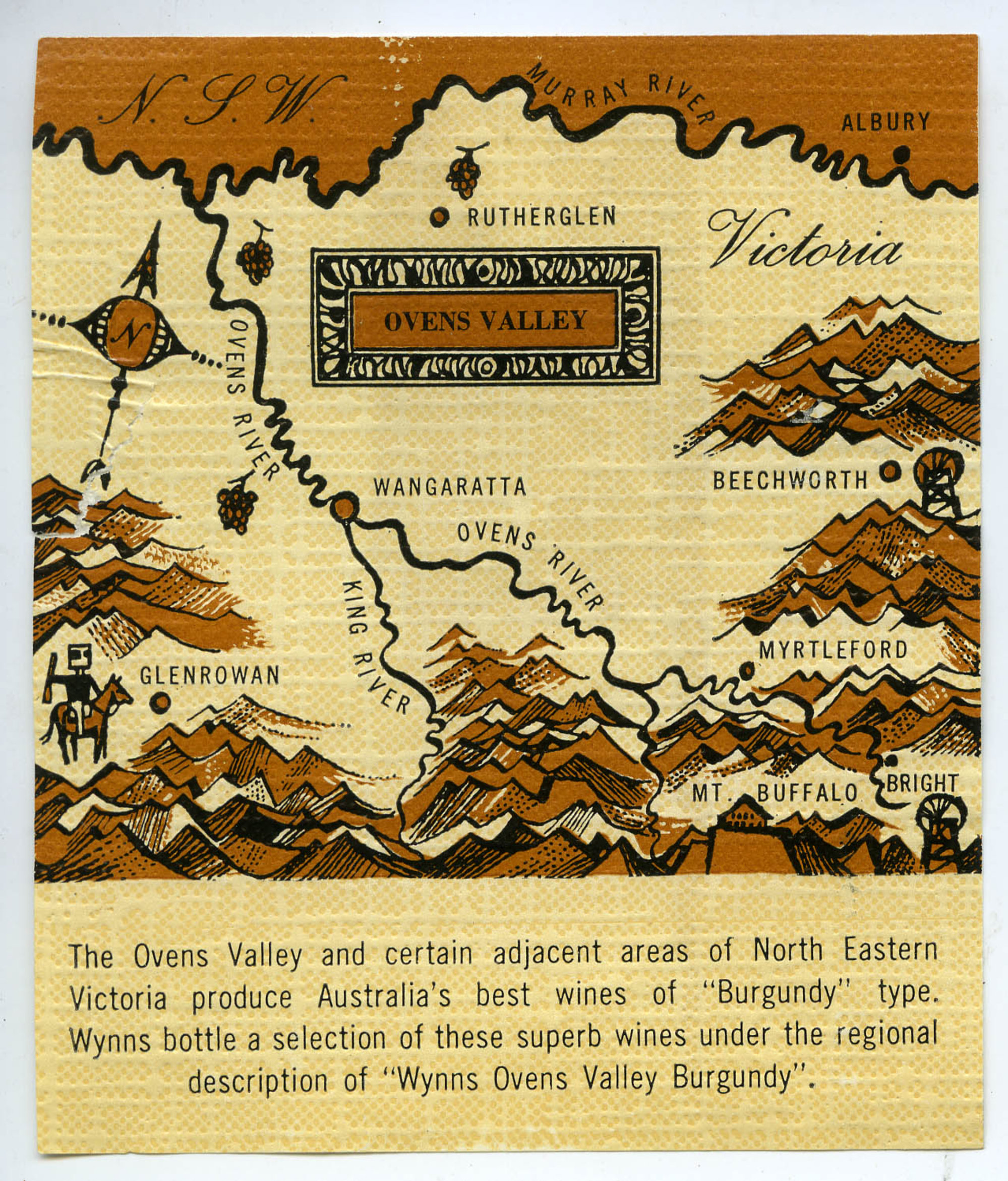 Label reads: "The Ovens Valley and certain adjacent areas of North Eastern Victoria produce Australia's best wines of "Burgundy" type. Wynns Bottle a selection of these superb wines under the regional description of "Wynns Ovens Valley Burgundy"