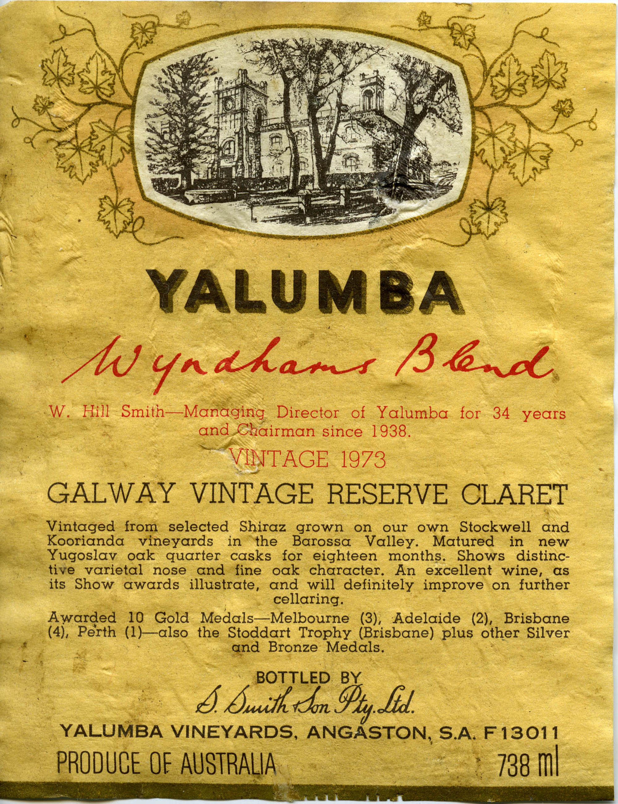Label reads: "Yalumba WYNDHAMS BLEND W.Hill Smith - Managing Director of Yalumba for 34 years and Chairmen since 1883 Vintage 1973 GALWAY VINTAGE RESERVE CLARET Vintaged from selected Shiraz grown on our own Stockwell and Koorianda vineyards in the Barossa Valley. Matured in new Yugoslav oak quarter casks for eighteen months. Shows distinctive varietal nose and fine oak character. An excellent wine, as its Show Awrads illustrate, and will definitely improve on further cellaring. Awarded: 10 Gold Medals - Melbourne (3), Adelaide (2), Brisbane (4), Perth (1) - also the Stoddart Trophy (Brisbane) plus other Silver and Bronze Medals. Bottled by S Smith and Son Pty. Ltd. Yalumba Vineyards Angaston S.A. Produce of Australia 738ml"