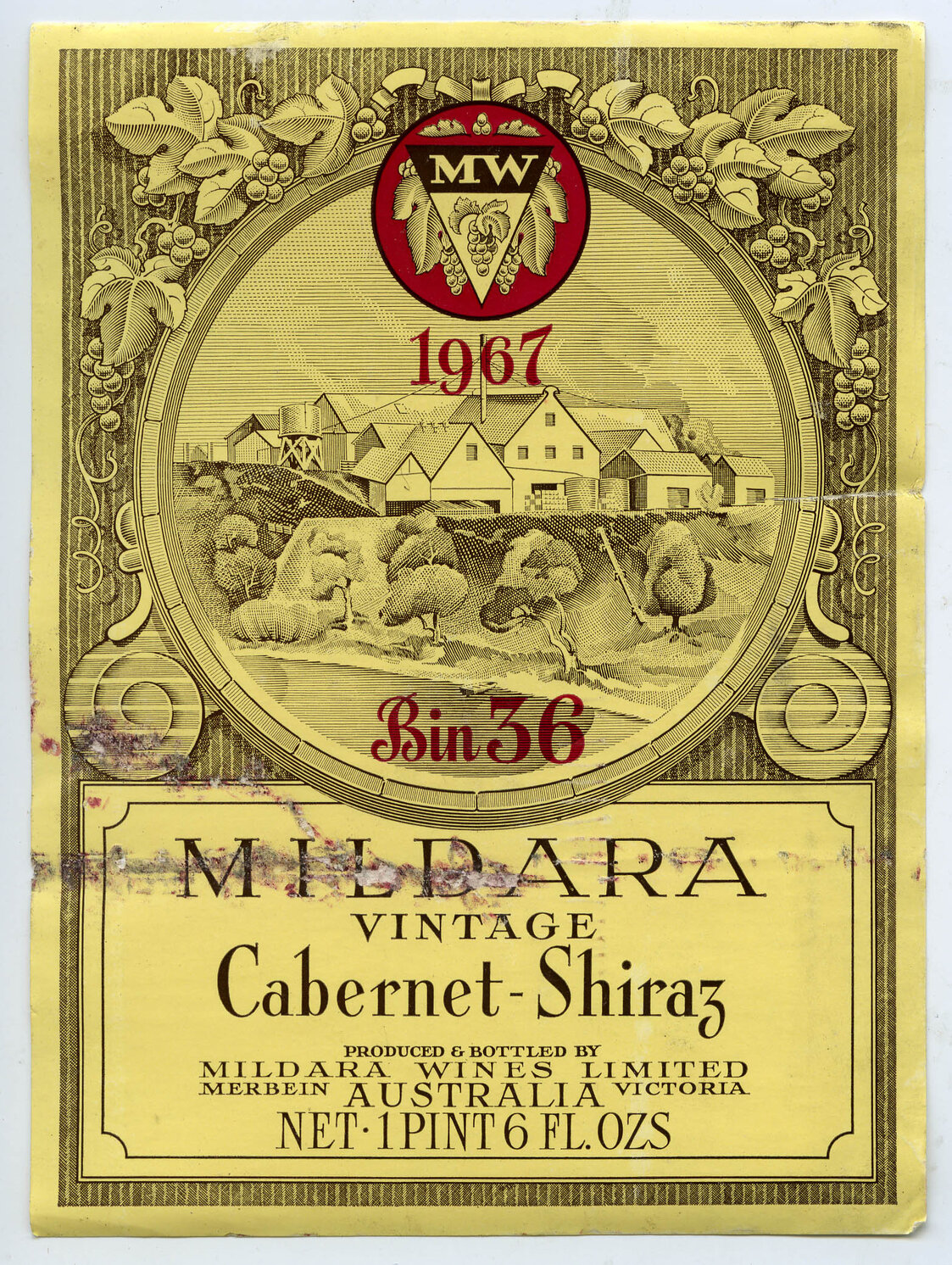 Label reads: "1967 Bin 36 Mildara Vintage CABERNET - SHIRAZ Mildara Wines Limited Merbein, Victoria, Australia Net 1 Pint 6 Fl. Oz"