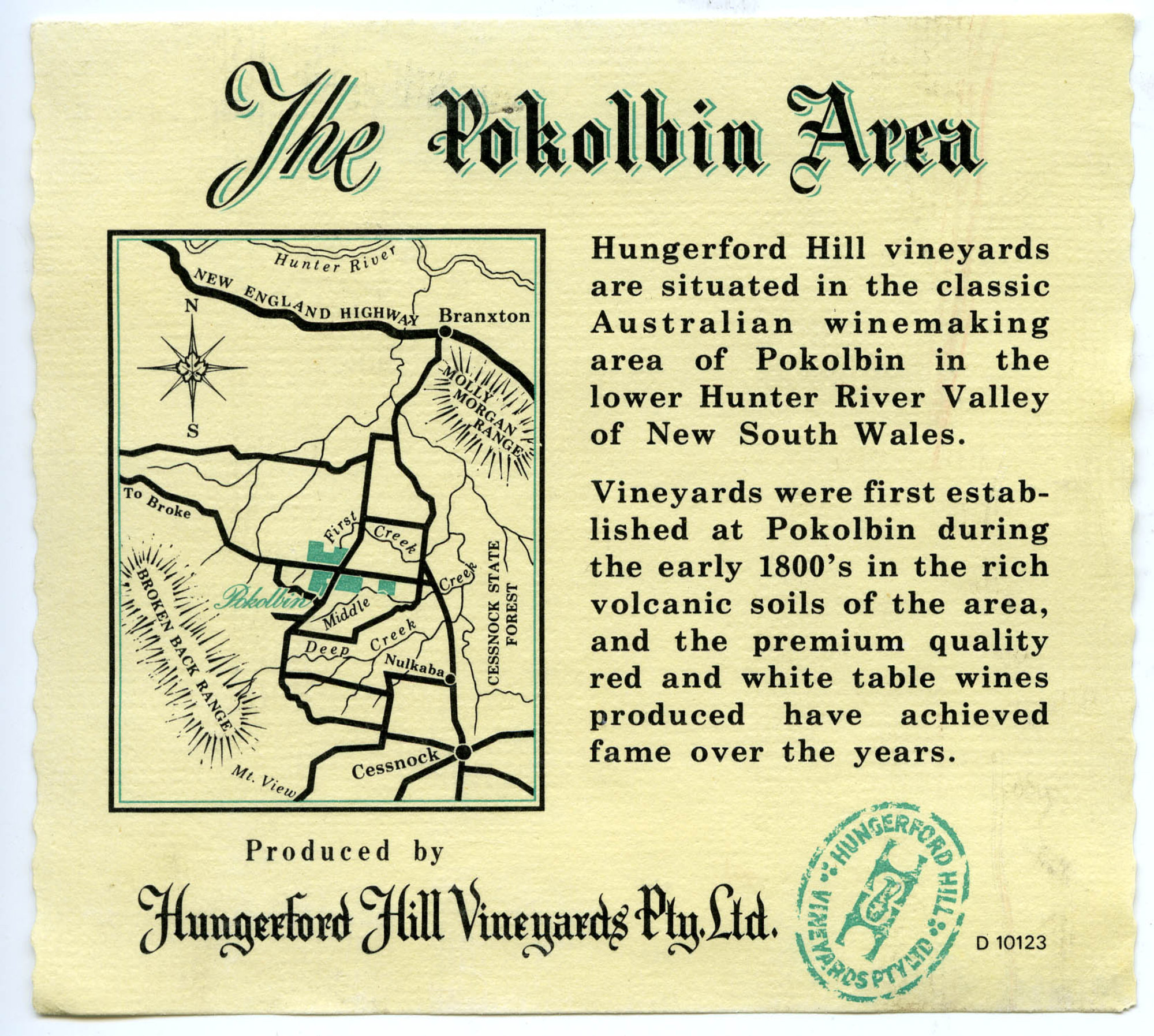 Wine MakerBryan CurrieWineryHungerford Hill WineryCollectorMorse, AllanLanguageEnglishDescriptionLabel reads: "The Pokolbin Area Hungerford Hill vineyards are situated in the classic Australian winemaking area of Pokolbin in the lower Hunter River Valley of New South Wales. Vineyards were first established at Pokolbin during the early 1800's in the rich volcanic soils of the area,and the premium quality red and white table wines produced have achieved fame over the years. Produced by Hungerford Hill Vinyards Pty. Ltd