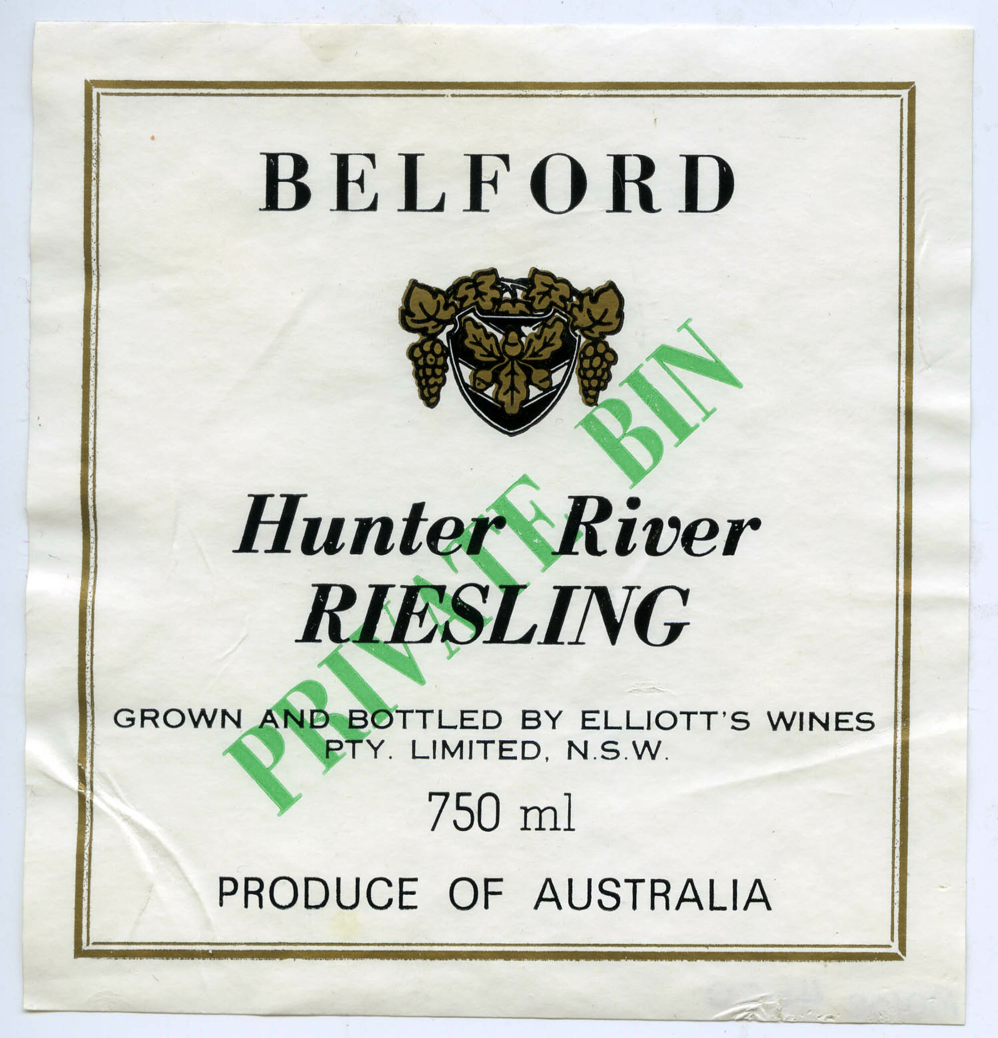 Label reads: "Belford Hunter River RIESLING Grown and Bottled by Elliot's Wines Pty. Ltd. N.S.W. 738ml Produce of Australia"