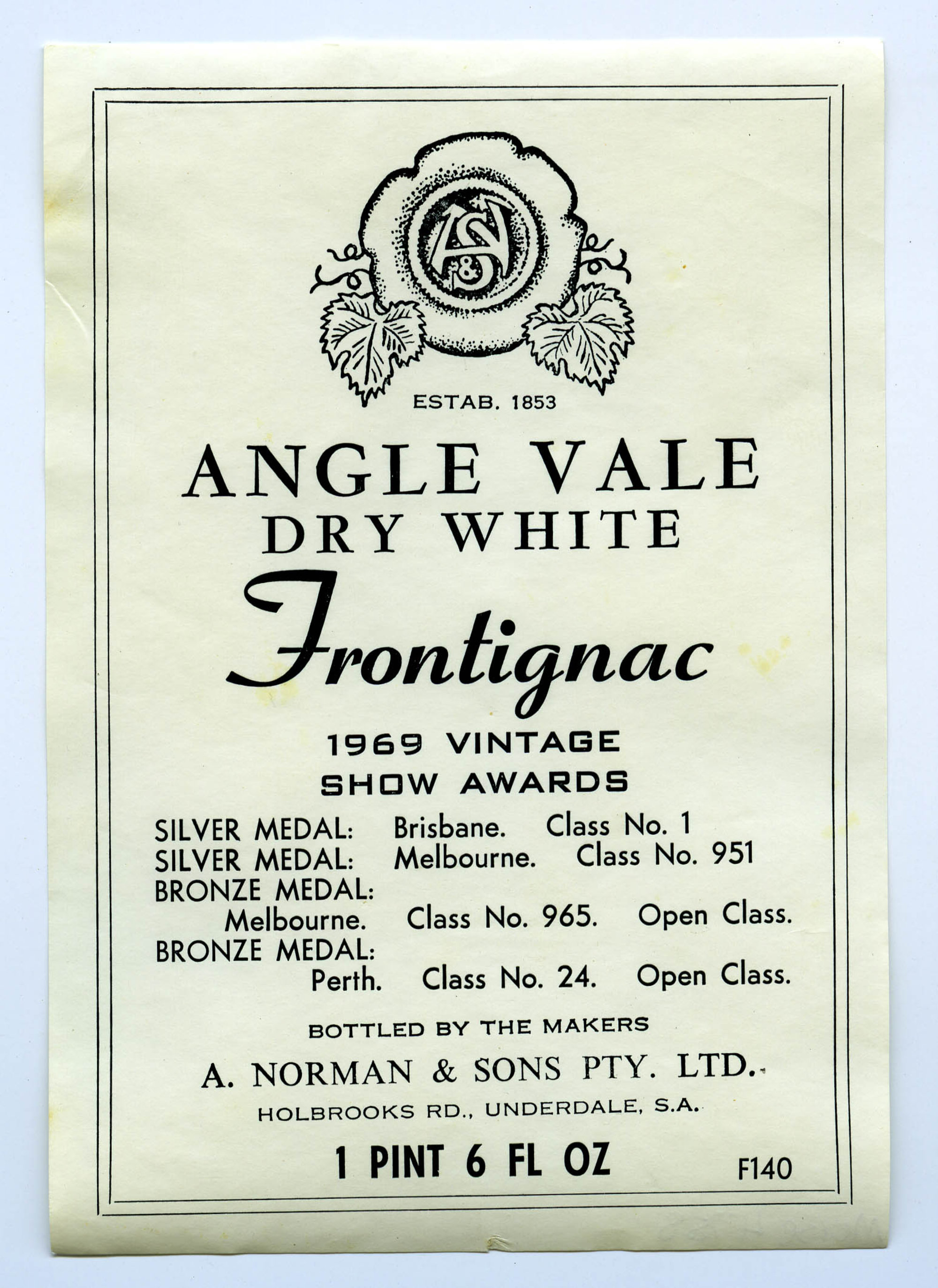 Label reads: "Angle Vale DRY WHITE FRONTIGNAC 1969 Vintage Show Awards Silver Medal: Brisbane. Class No. 1 Silver Medal: Melbourne Class No. 951 Bronze Medal: Class No. 965 Open Class Bronze Medal: Perth Class No. 24 Open Class Bottled by the makers A Norman and Sons Pty. Ltd. Holbrooks Rd Underdale S.A. 1 PINT 6 FL. OZ."