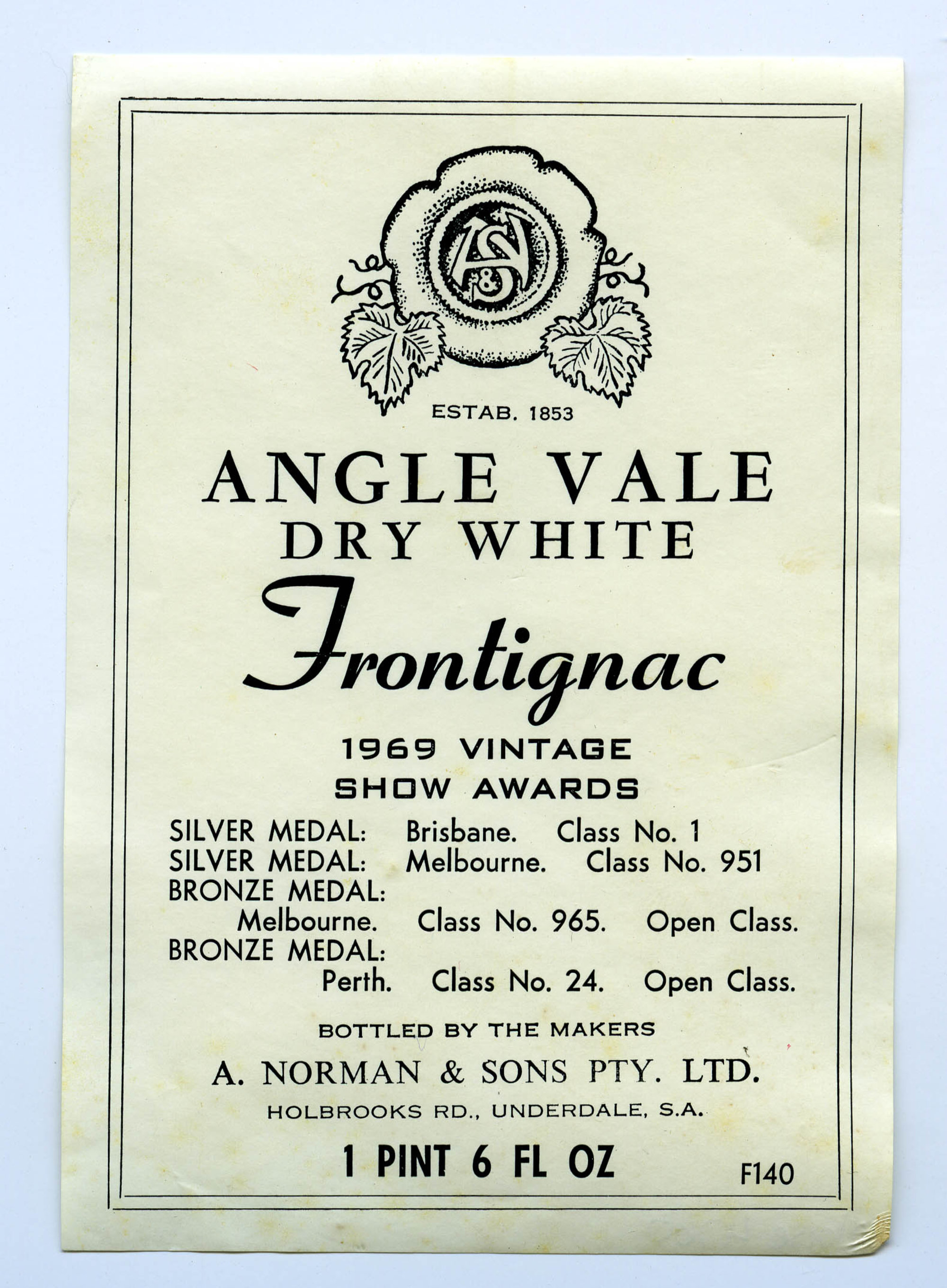 Label reads: "Angle Vale DRY WHITE FRONTIGNAC 1969 Vintage Show Awards Silver Medal: Brisbane. Class No. 1 Silver Medal: Melbourne Class No. 951 Bronze Medal: Class No. 965 Open Class Bronze Medal: Perth Class No. 24 Open Class Bottled by the makers A Norman and Sons Pty. Ltd. Holbrooks Rd Underdale S.A. 1 PINT 6 FL. OZ."