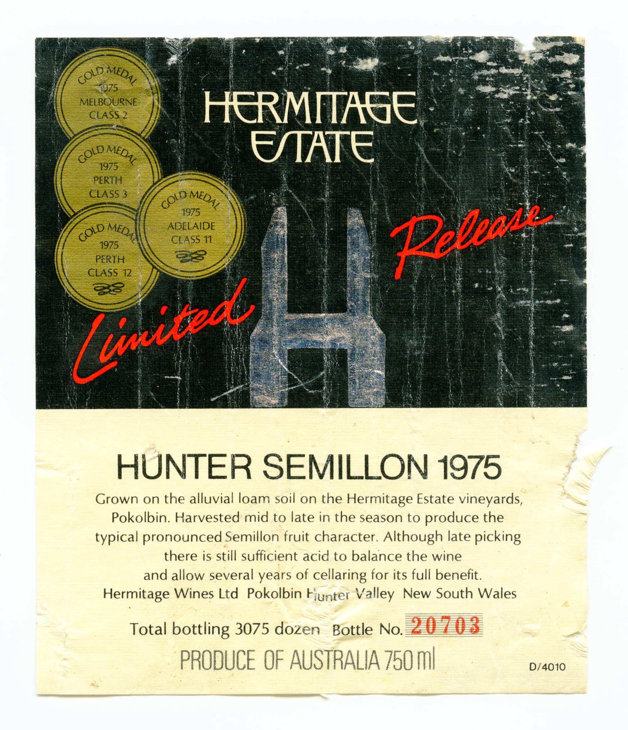 Label reads: "Hermitage Estate Limited Release HUNTER SEMILLON 1975 Grown on the alluvial soil on the Hermitage Estate vineyards, Pokolbin. Harvested mid to late in the season to produce the typical pronounced Semillon fruit character. Although late picking there is still sufficient acid to balance the wine and allow several years of cellaring for its full benefit Hermitage Wines Ltd. Pokolbin Hunter Valley New South Wales. Total bottling 3075 dozen Bottle No. 20703 Produce of Australia 750ml"