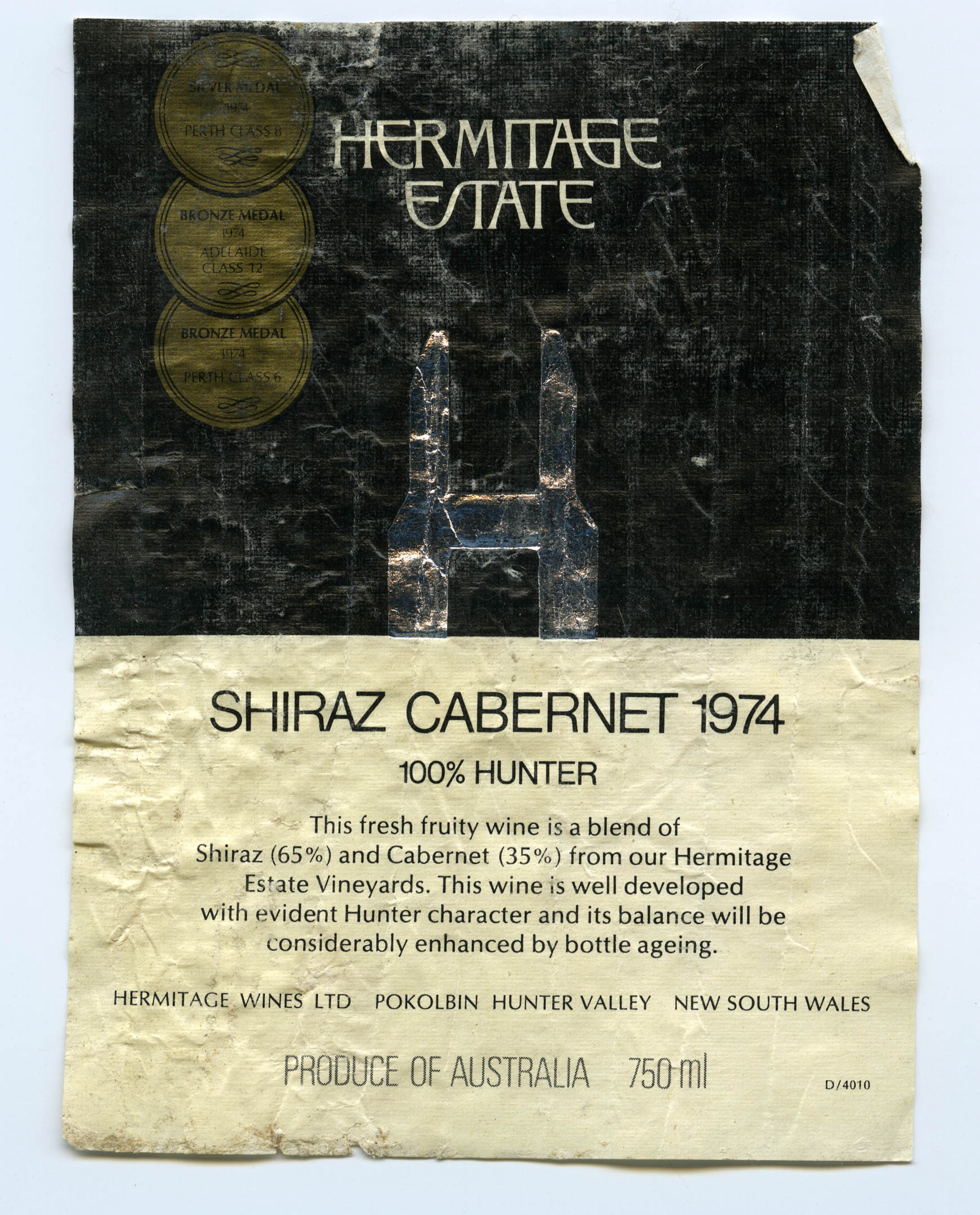 Label reads: "Hermitage Estate SHIRAZ CABERNET 1974 100% Hunter This fresh fruity wine is a blend of Shiraz(65%) and Cabernet (35%) from our Hermitage Estate Vineyards. This wine is well developed with evident Hunter charater and its balance will be considerably enhanced by bottling ageing. Hermitage Wines Ltd. Pokolbin Hunter Valley New South Wales Produce of Australia 750ml"