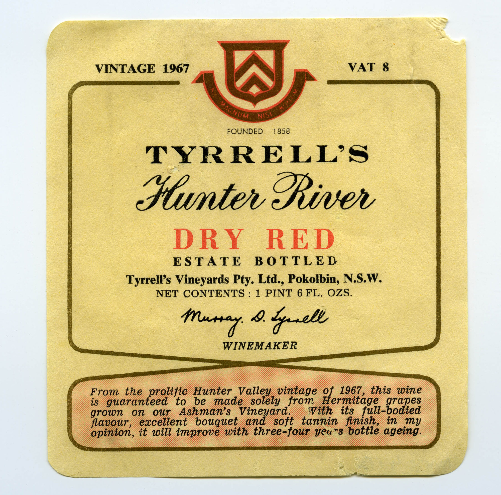 Label reads: "Vintage 1967 Vat 8 Founded 1858 Tyrrell's Hunter River DRY RED Estate Bottled Tyrrell's Vineyards Pty. Ltd. Pokolbin N.S.W. Murray D Tyrrell Winemaker From the polific Hunter Valley vintage of 1967, this wine is guaranteed to be made solely from Hermitage grapes grown on our Ashman's Vineyard. With its full-bodied flavour excellent bouquetand soft tannin finish in my opinion it will improve with three-four years bottle ageing."