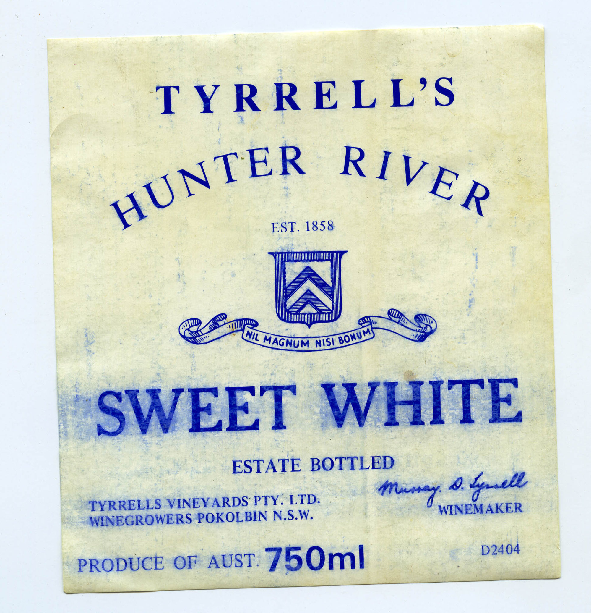 Label reads: "Tyrrell's Hunter River SWEET WHITE Estate Bottled Tyrrells Vineyards Pty. Ltd. Winegrowers Pokolbin N.S.W. Murray D Tyrrell Winemaker Produce of Australia 750ml"