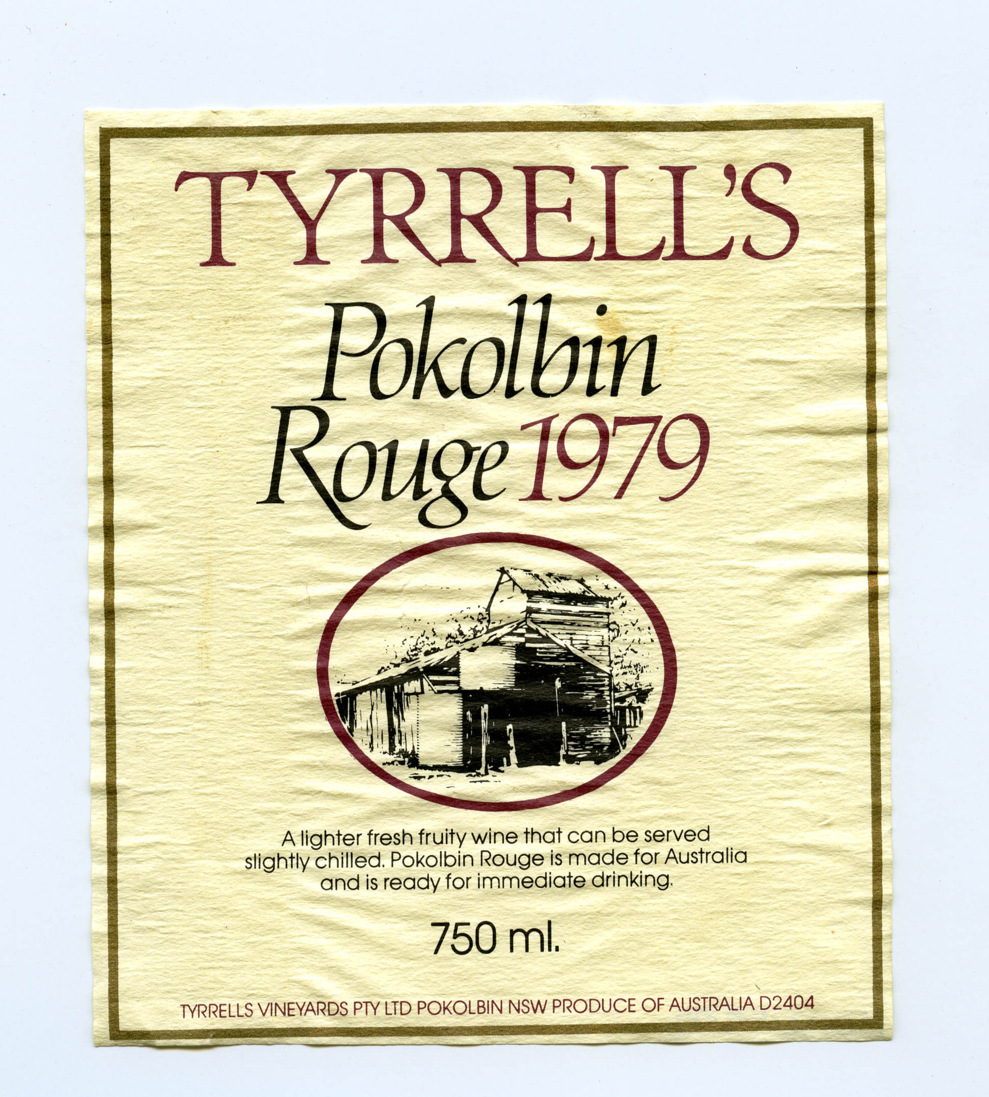 Label reads: "Tyrrell's POKOLBIN ROUGE 1979 A lighter fresh fruity wine that can be served slighty chilled. Pokolbin Rouge is made for Australia and is ready for immediate drinking 750ml Tyrrells Vineyards Pty.Ltd. Pokolbin NSW Produce of Australia D2404"