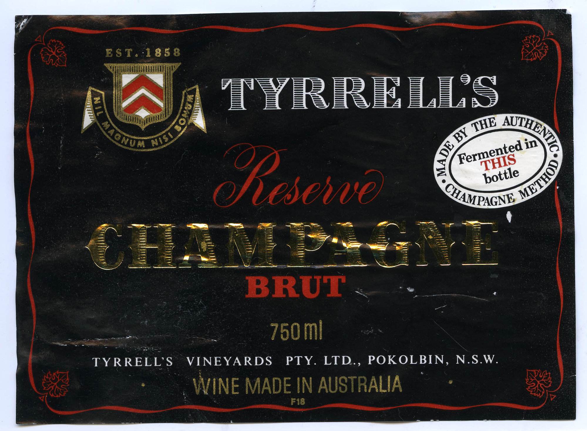Label reads: "Est. 1858 Tyrrell's Reserve Champagne Brut 750ml Tyrrell's Vineyards Pty. Ltd. Pokolbin, N.S.W. Wine Made in Australia"