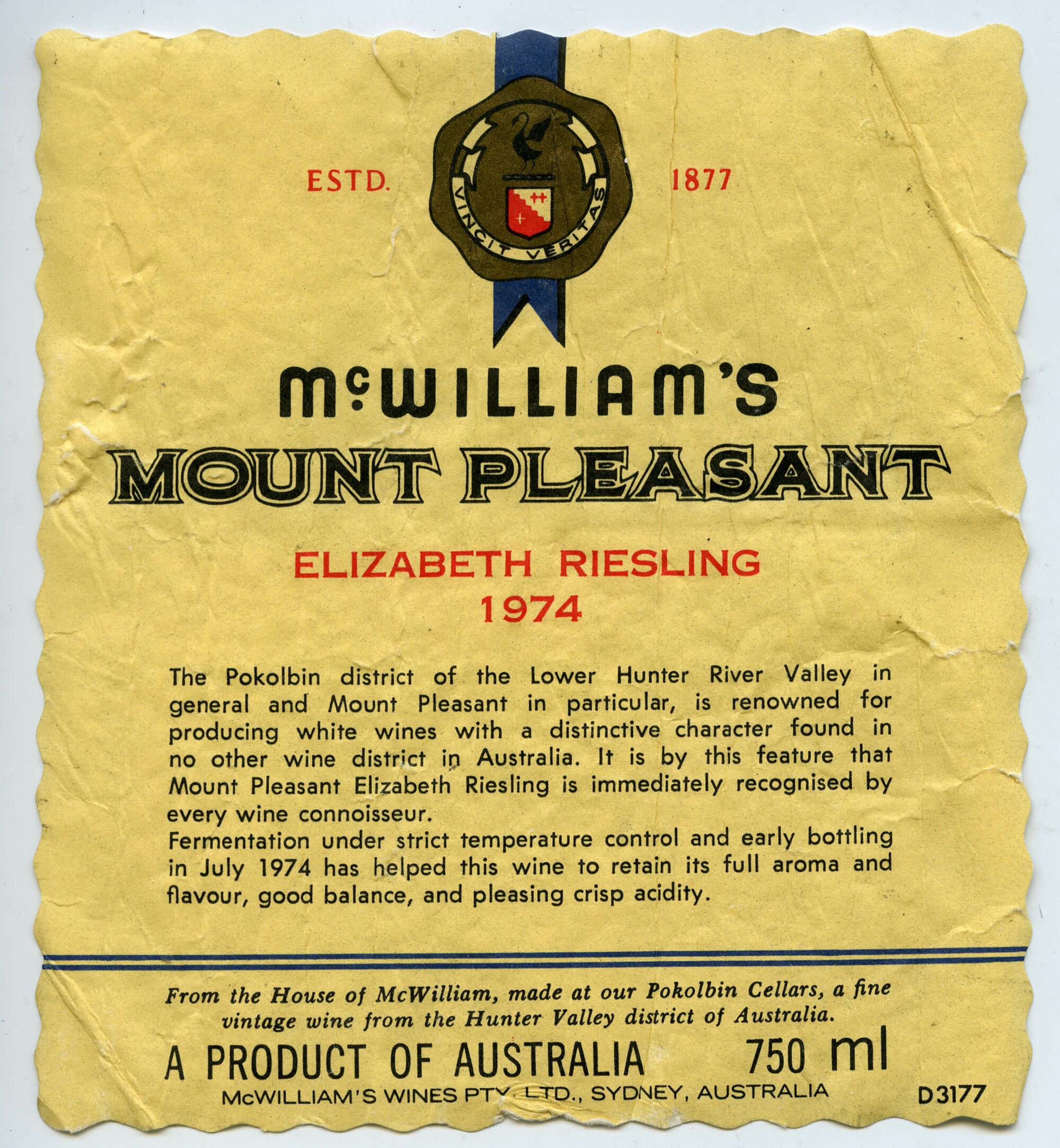 McWilliam's Mount Pleasant Label (1974) (1974). Living Histories, accessed 15/04/2026, https://livinghistories.newcastle.edu.au/nodes/view/64921