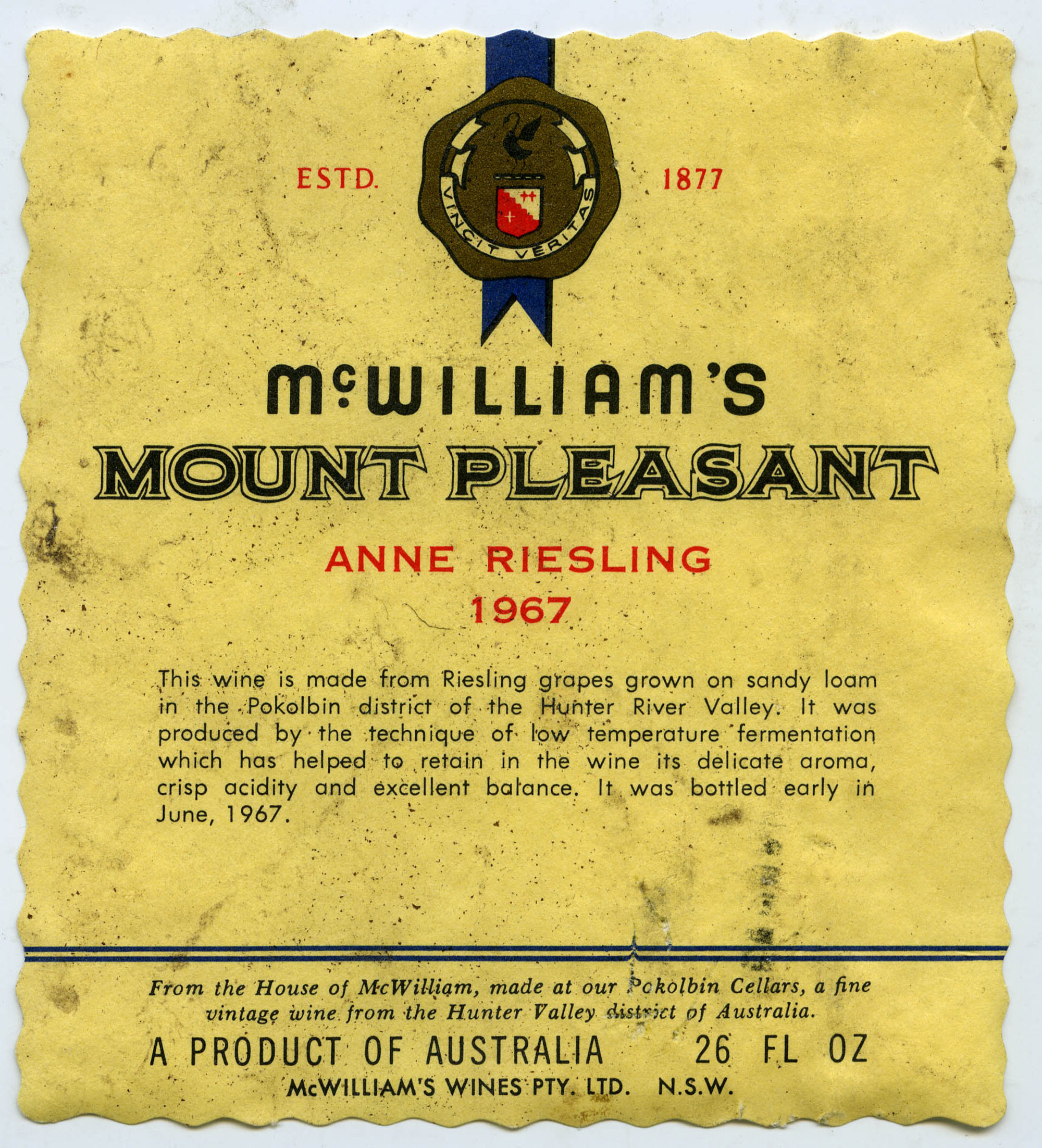 McWilliam's Mount Pleasant Label (1967) (1967). Living Histories, accessed 18/01/2026, https://livinghistories.newcastle.edu.au/nodes/view/64941