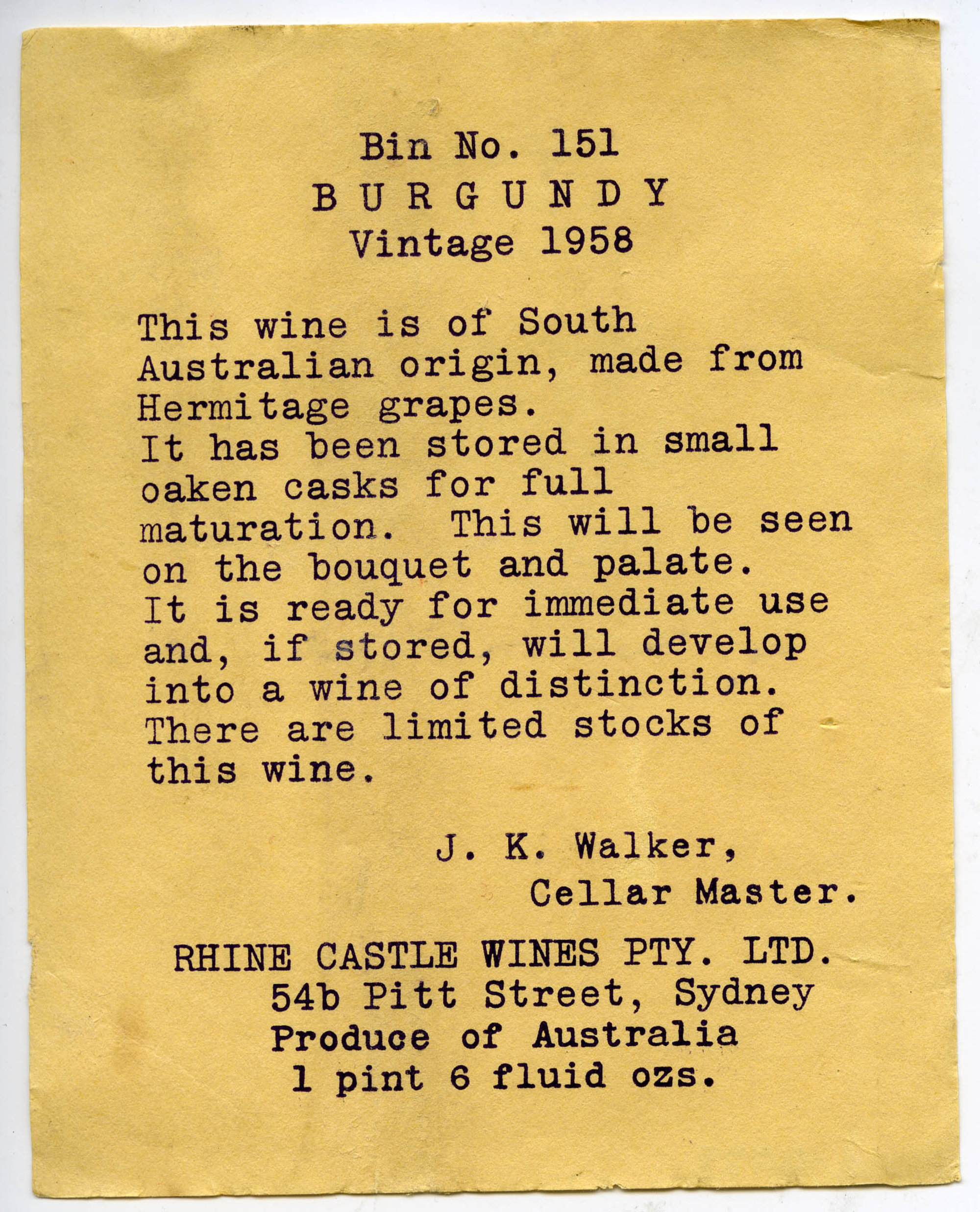 Label reads: Bin No. 151 BURGUNDY Vintage 1967 This wine is South Australian origin, made from Hermitage grapes. It has been stored in small oaken casks for full maturation. This will be seen on the bouquet and palate. It is ready for immediate use and if stored will develop into a wine of distinction. There are limited stocks of this wine. J.H. Walker, Cellar Master Rhine Castle Wines Pty. Ltd. 54b Pitt Street, Sydney Produce of Australia 1 pint 6 Fluid ozs"
